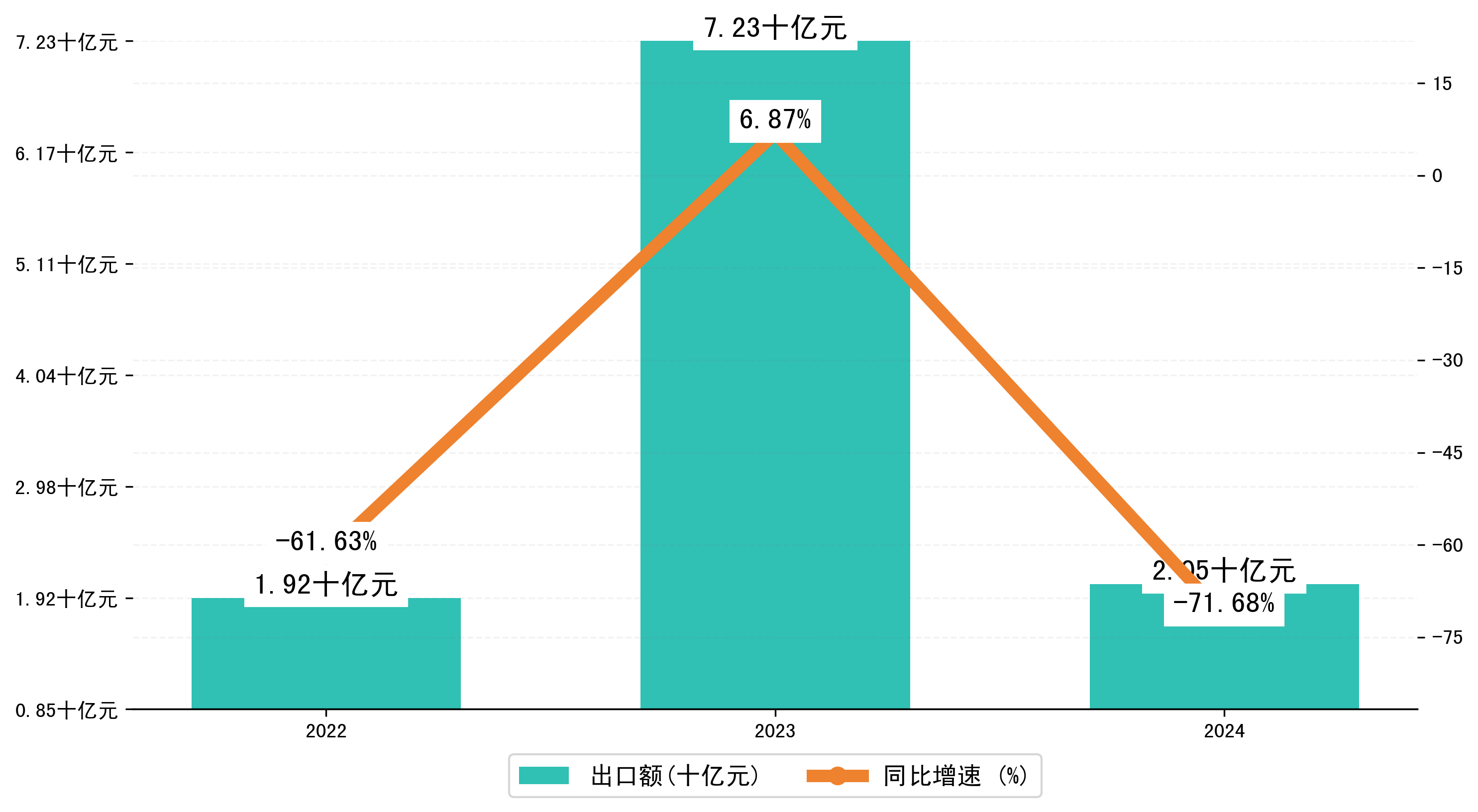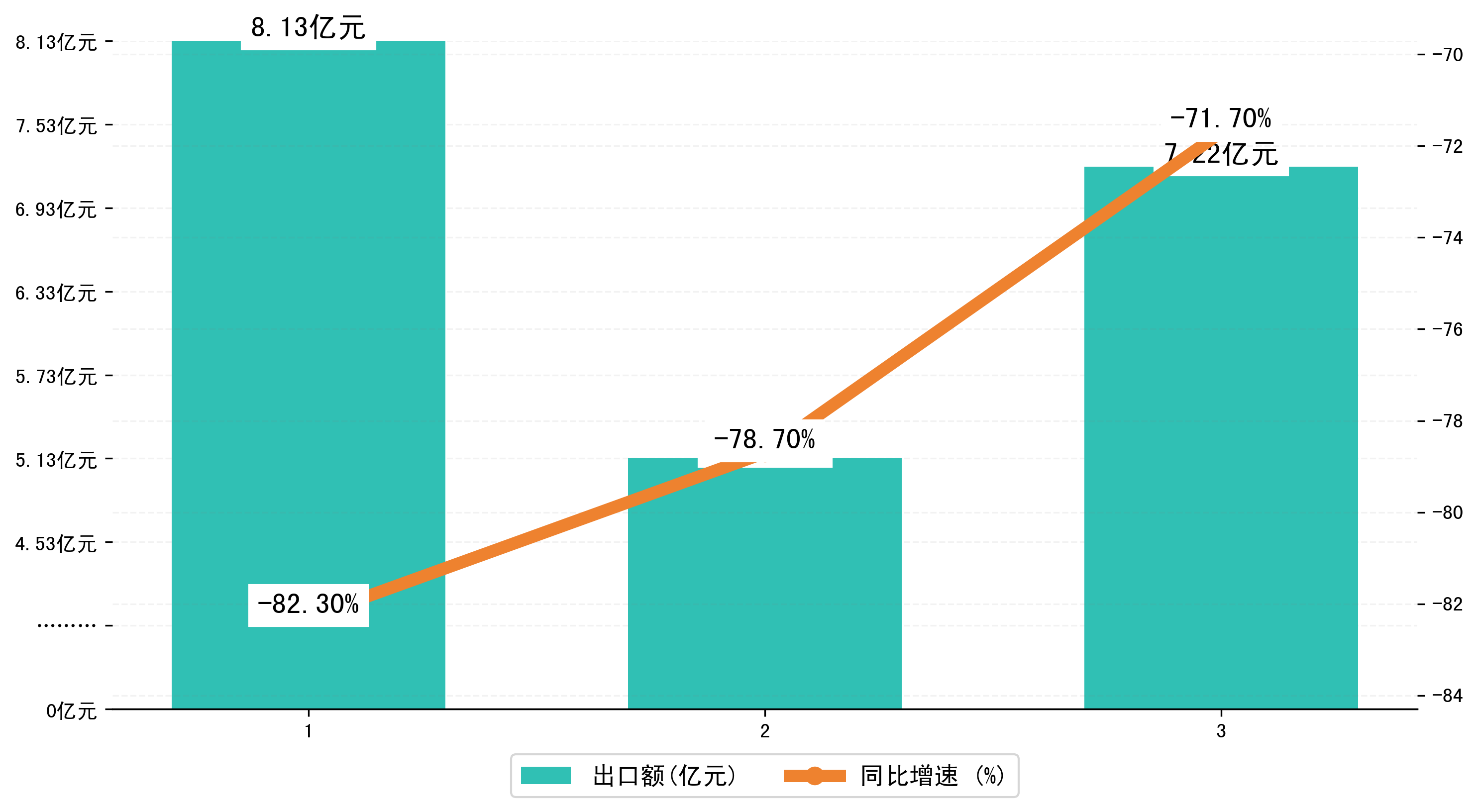以人民币计,2024年1-3月岳阳市出口额为20,4872.4868万元,相比上年同期减少了51,8604.8955万元,同比减少了-71.70%。