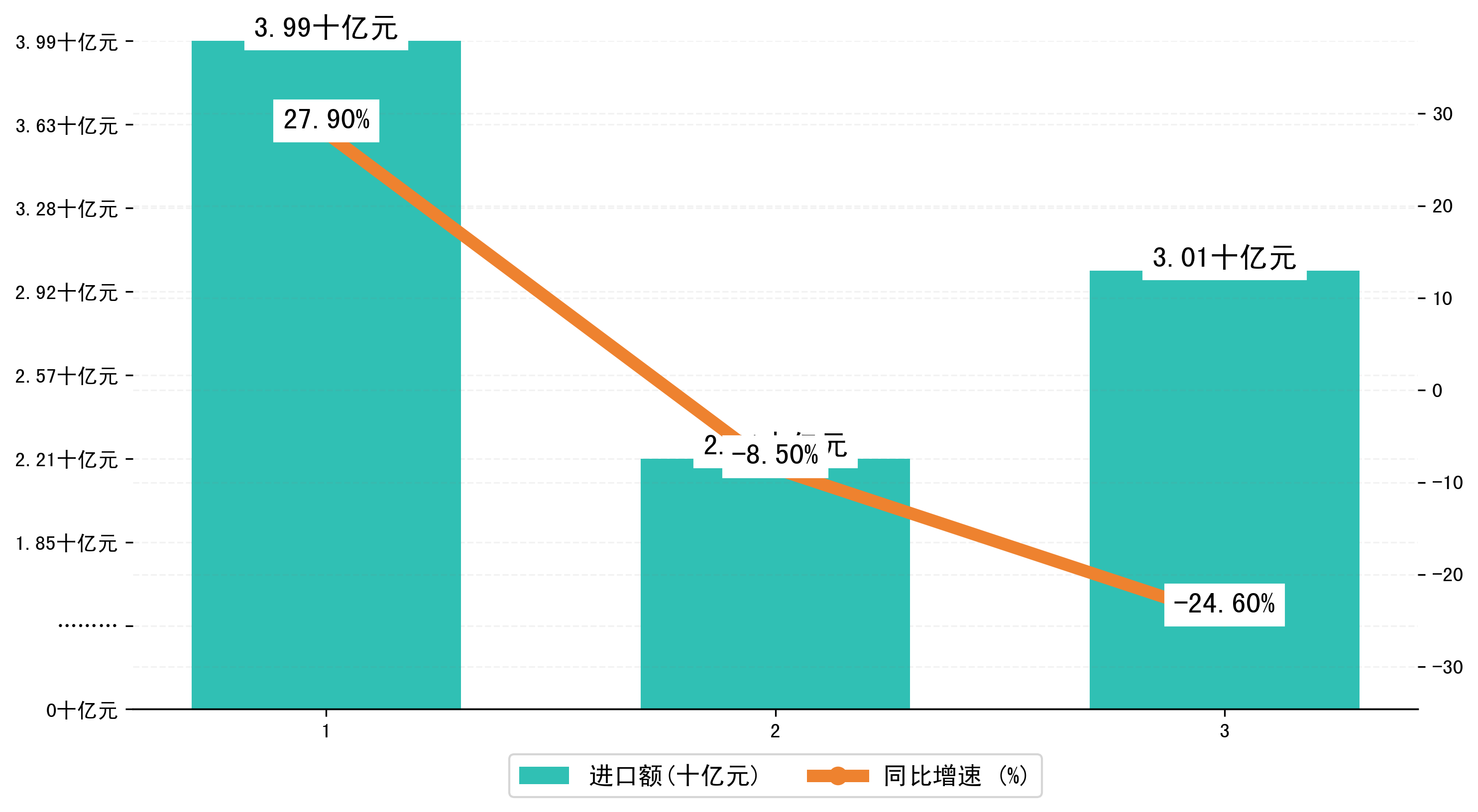 以人民币计,2024年3月岳阳市进口额为30,0986.0208万元,相比上月增加了7,9975.0922万元;相比上年同期减少了24,3746.8272万元,同比减少了-24.60%。