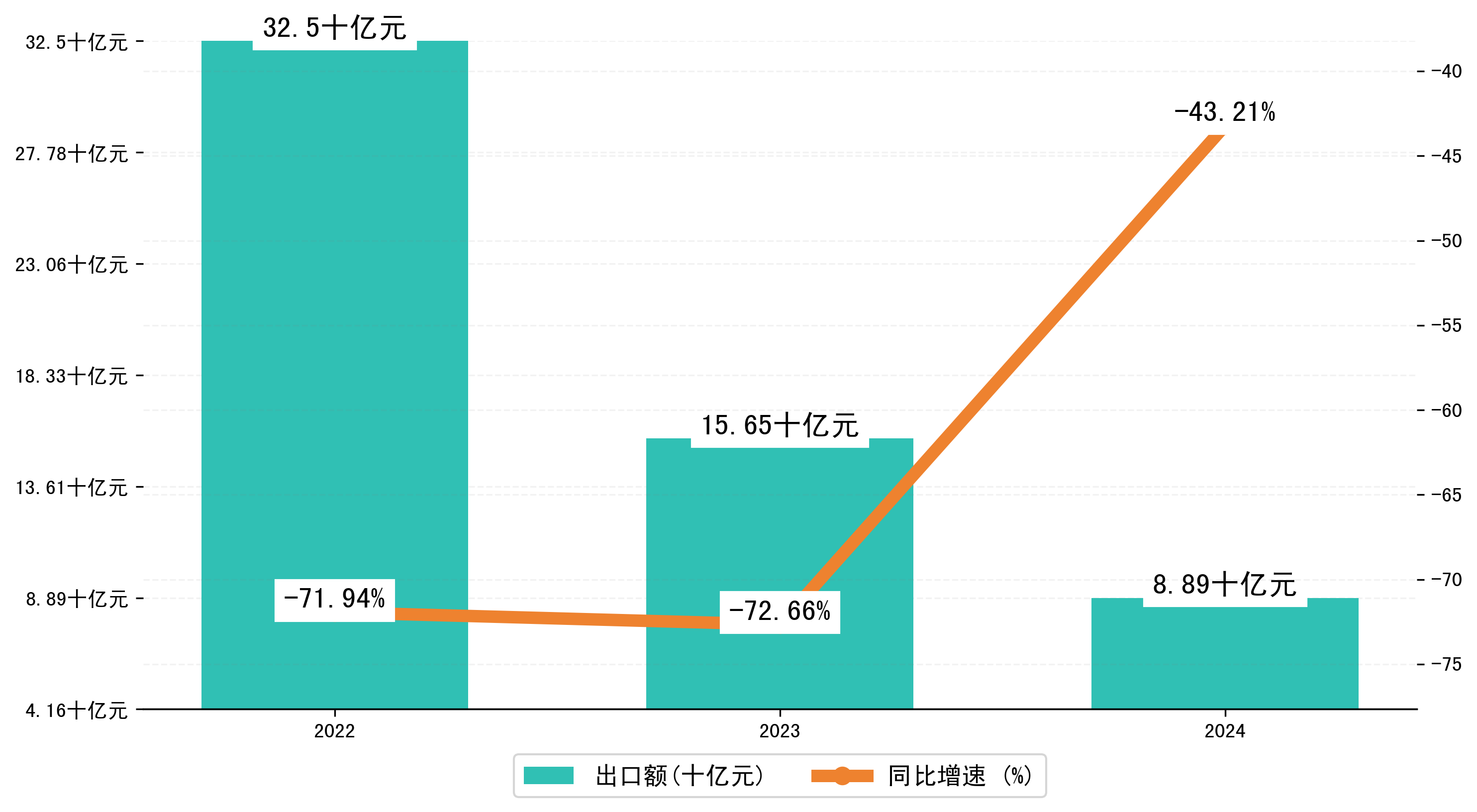 以人民币计,2024年1-12月岳阳市出口额为88,8673.0346万元,相比上年同期减少了67,6212.0759万元,同比减少了-43.20%。