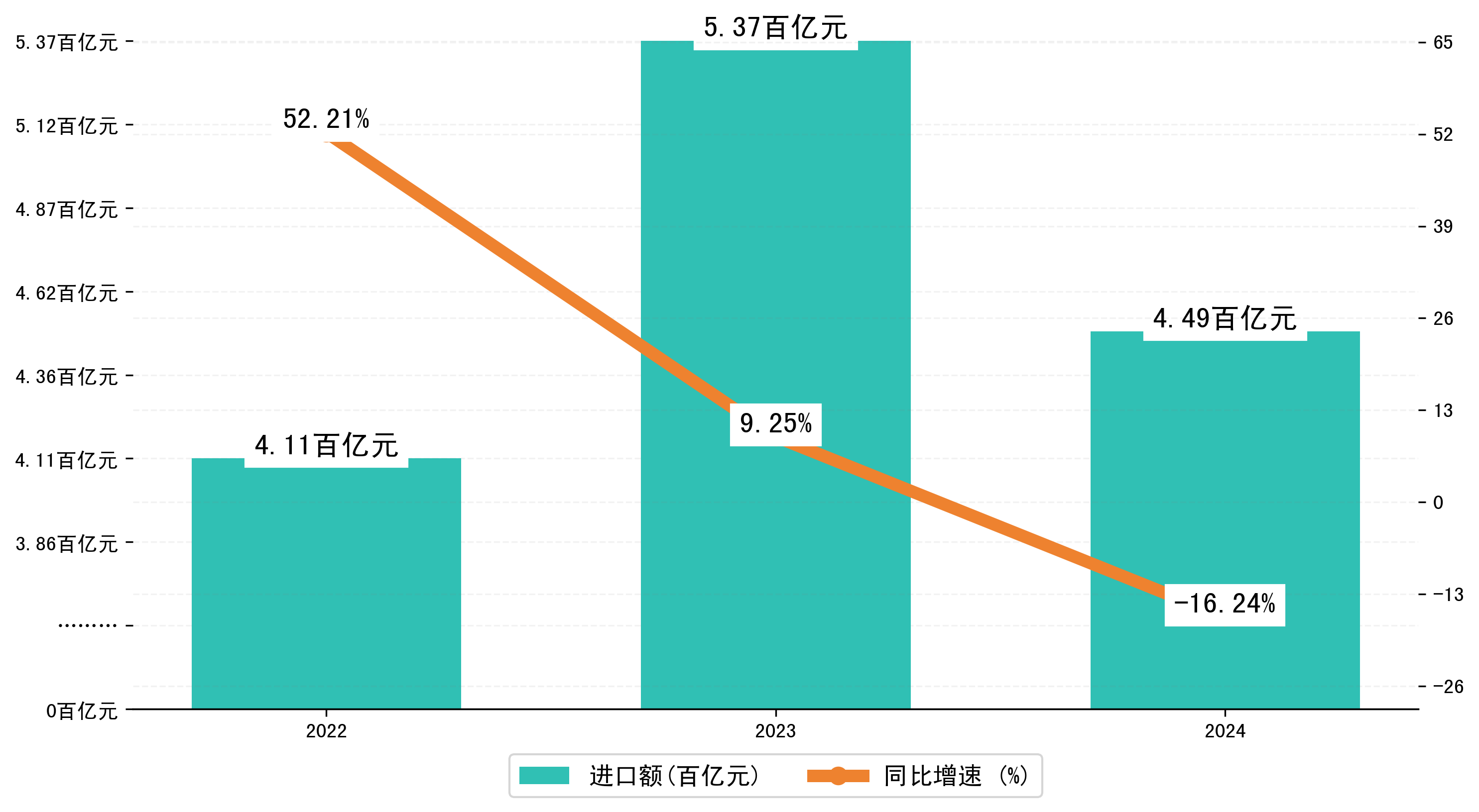 以人民币计,2024年1-12月岳阳市进口额为449,4980.1964万元,相比上年同期减少了87,1583.1828万元,同比减少了-16.20%。