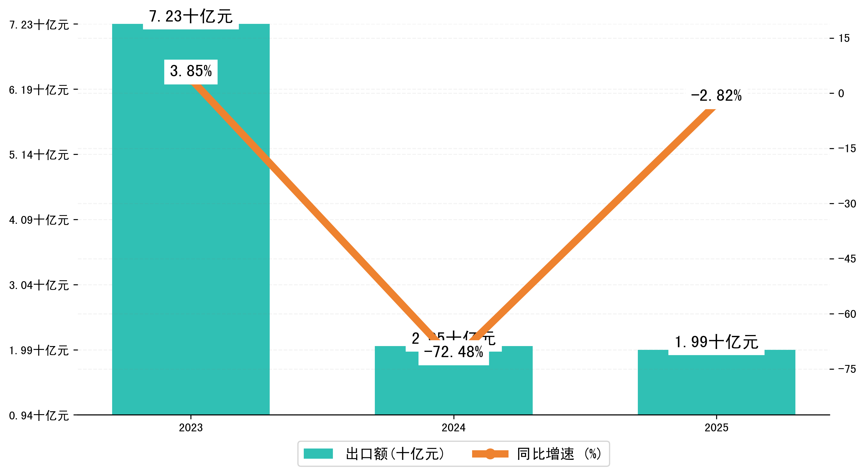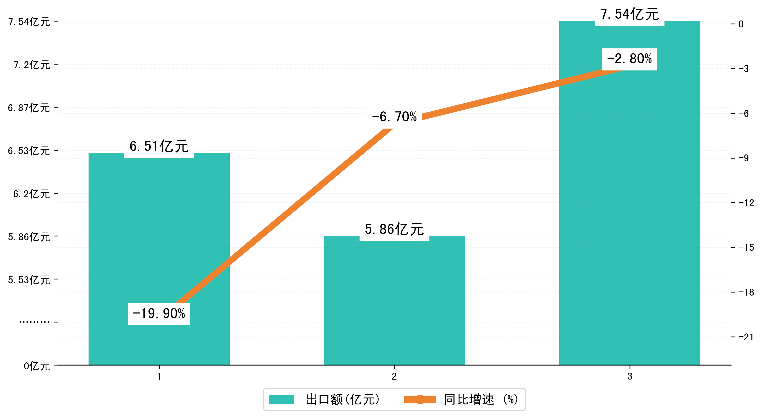 以美元计,2025年1-3月岳阳市出口额为2,7715.1541万美元,相比上年同期减少了1079.5823万美元,同比减少-3.70%。