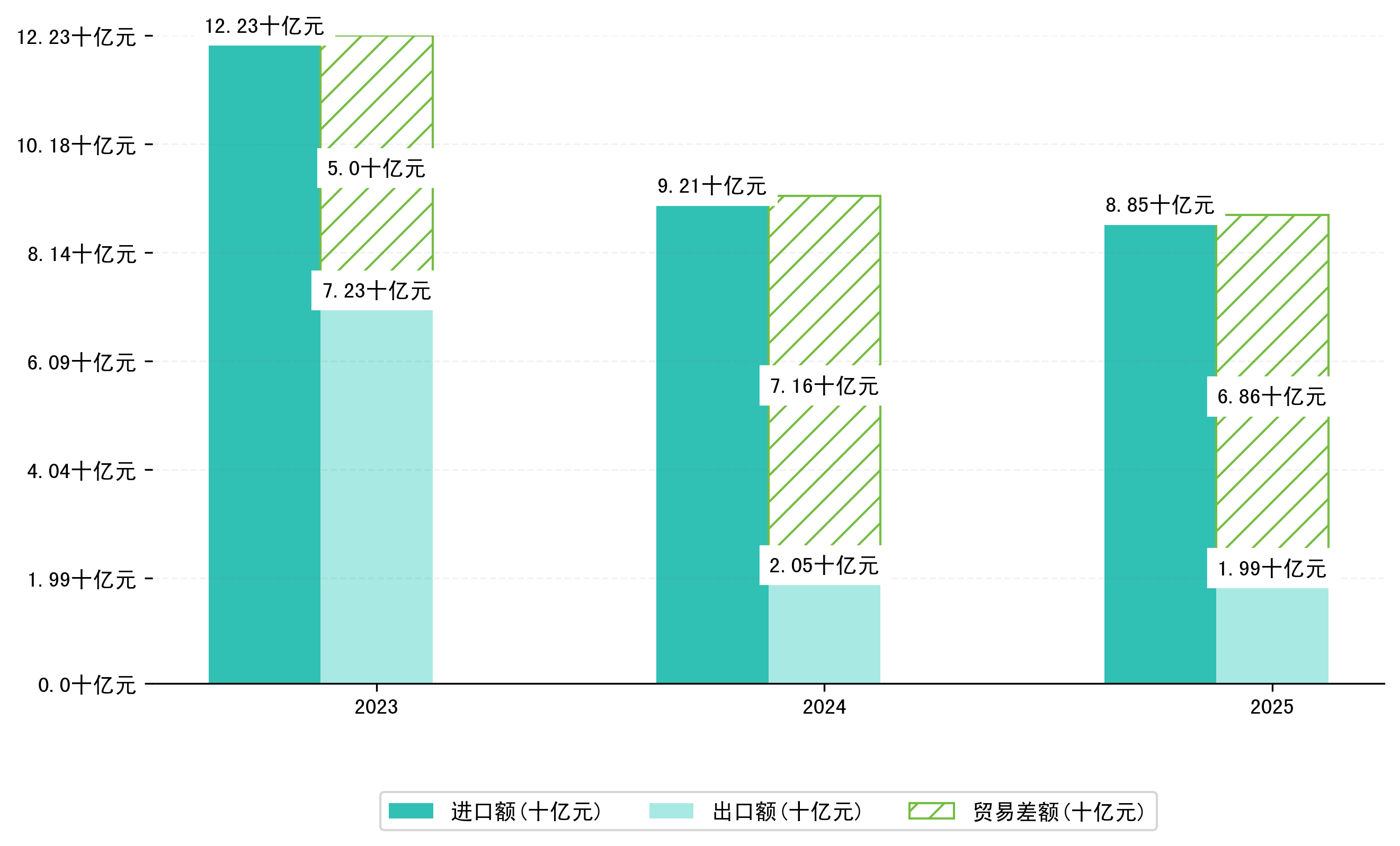 以美元计,2025年1-3月岳阳市贸易差额为9,5536,6197万美元(贸易逆差),相比上年同期增加了5239,7054万美元,同比增加-5.2%。