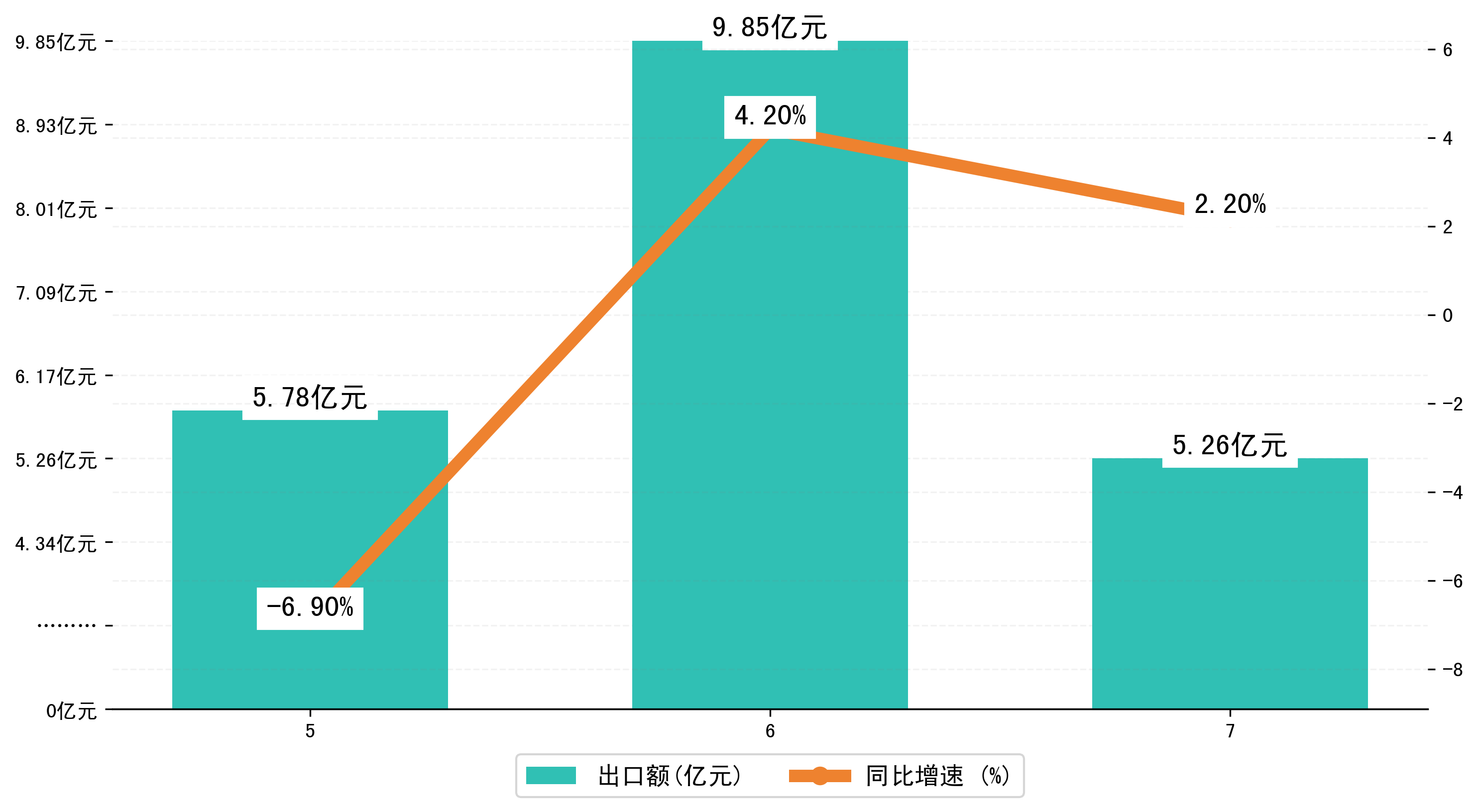 以美元计,2025年1-7月岳阳市出口额为6,6033.3317万美元,相比上年同期增加了708.3586万美元,同比增加1.10%。