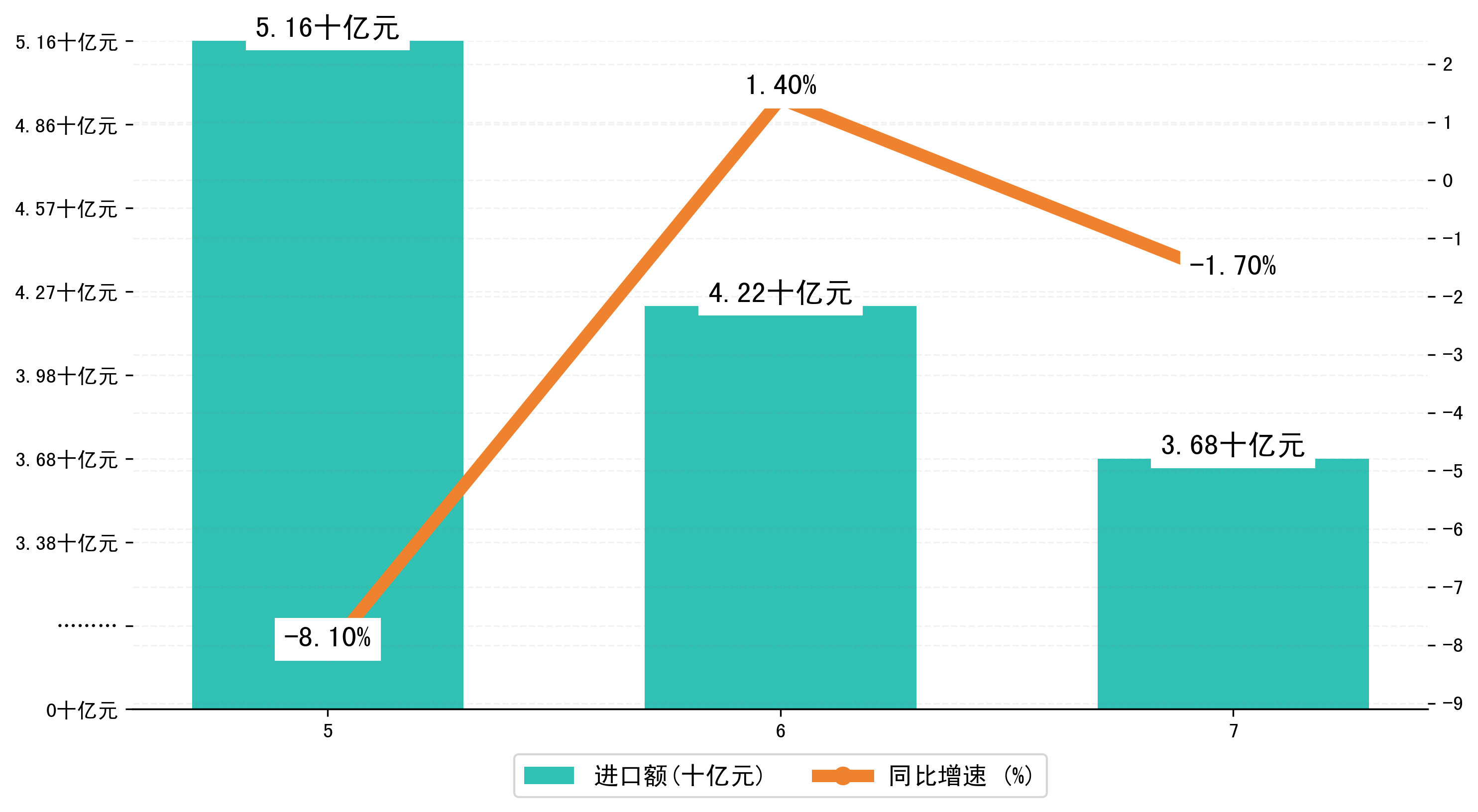 以美元计,2025年1-7月岳阳市进口额为33,5936.8506万美元,相比上年同期减少了1,1544.6518万美元,同比减少-2.80%。