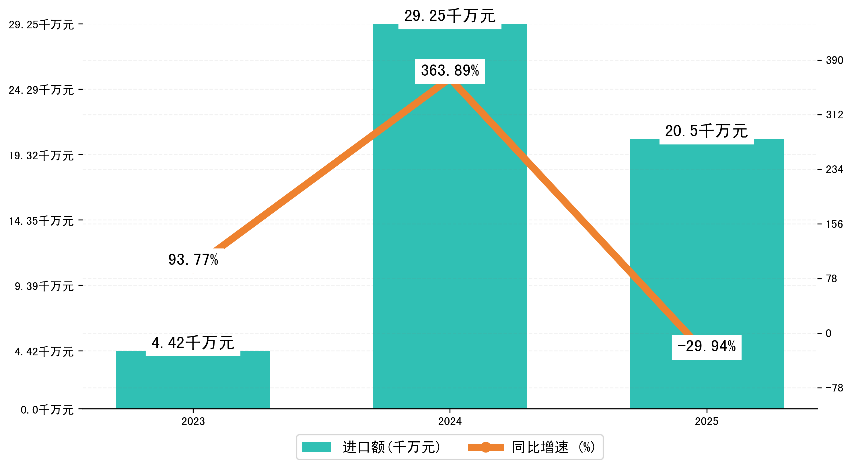 以人民币计,2025年1-1月榆林市进口额为2,0495.1814万元,相比上年同期减少了8758.1018万元,同比减少了-29.90%。