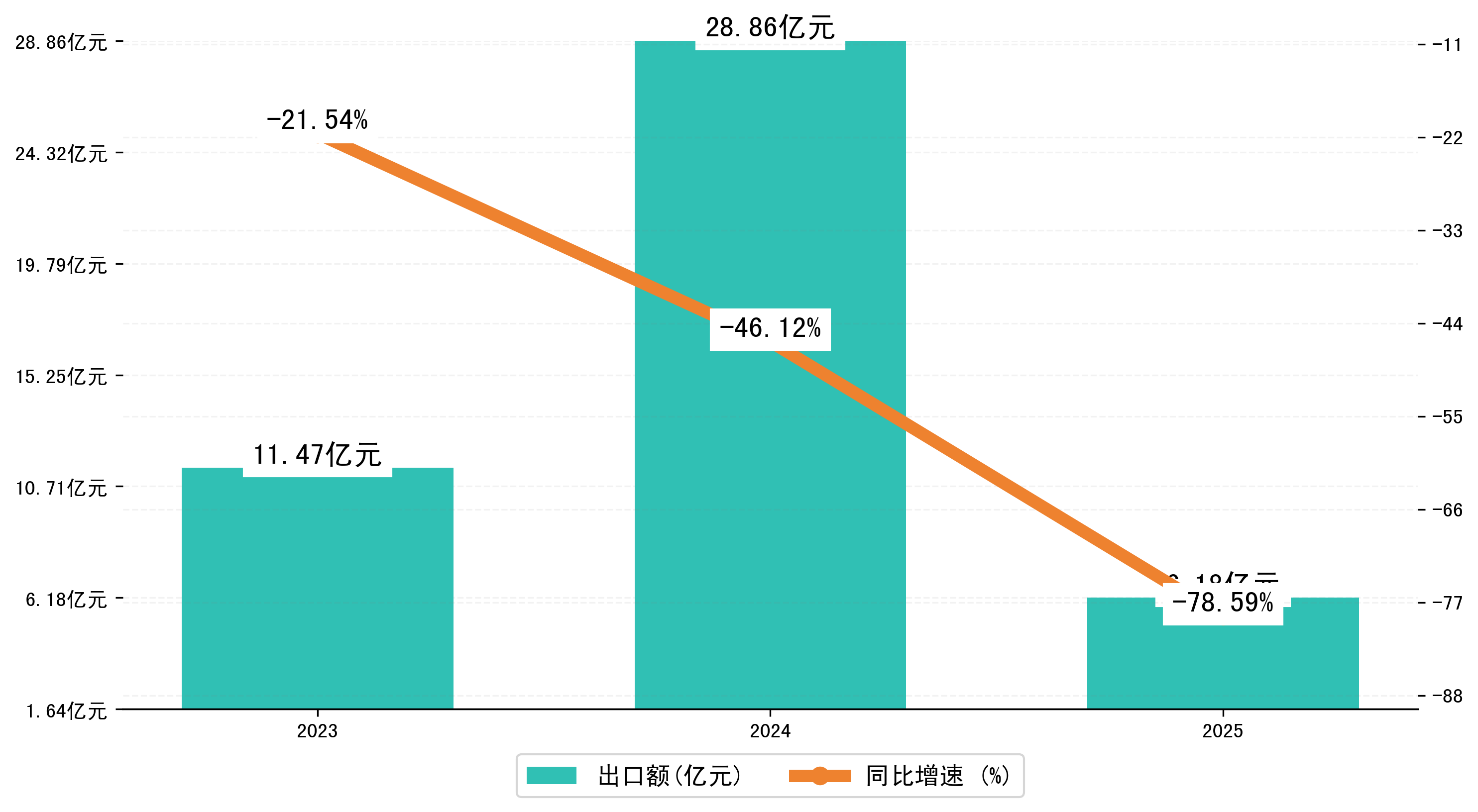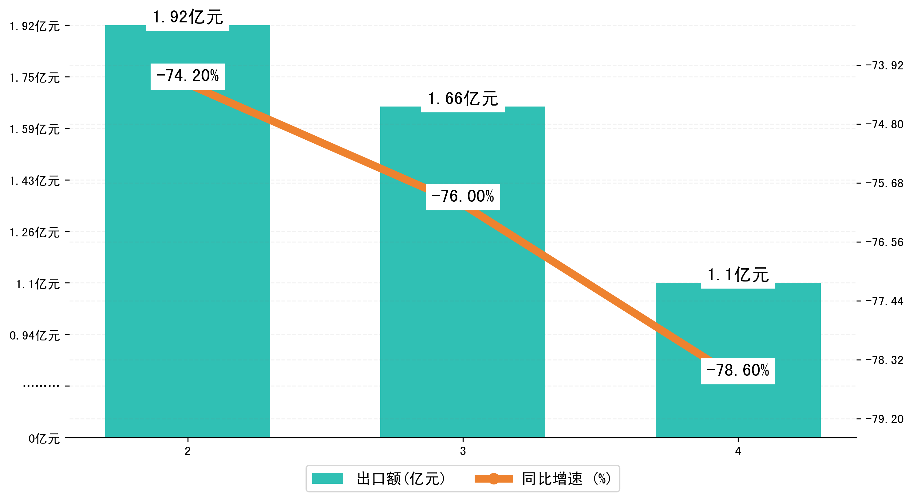 以美元计,2025年1-4月榆林市出口额为8635.9518万美元,相比上年同期减少了3,1972.9432万美元,同比减少-78.70%。