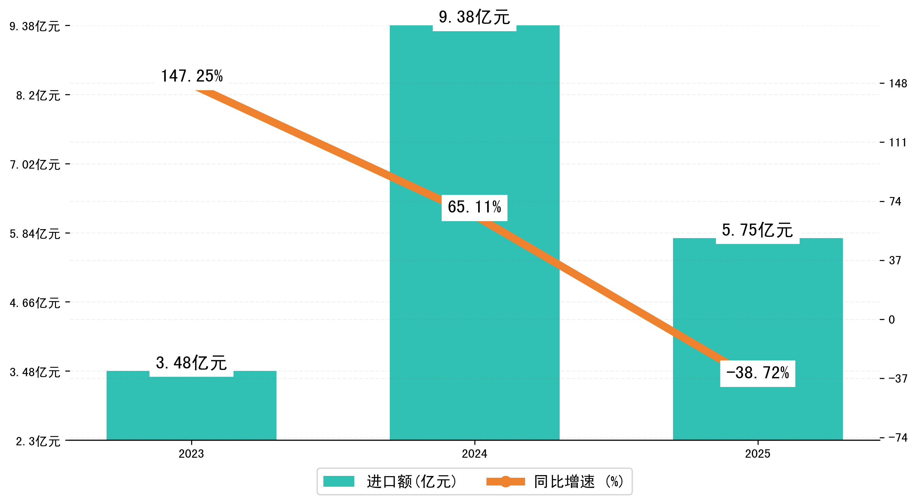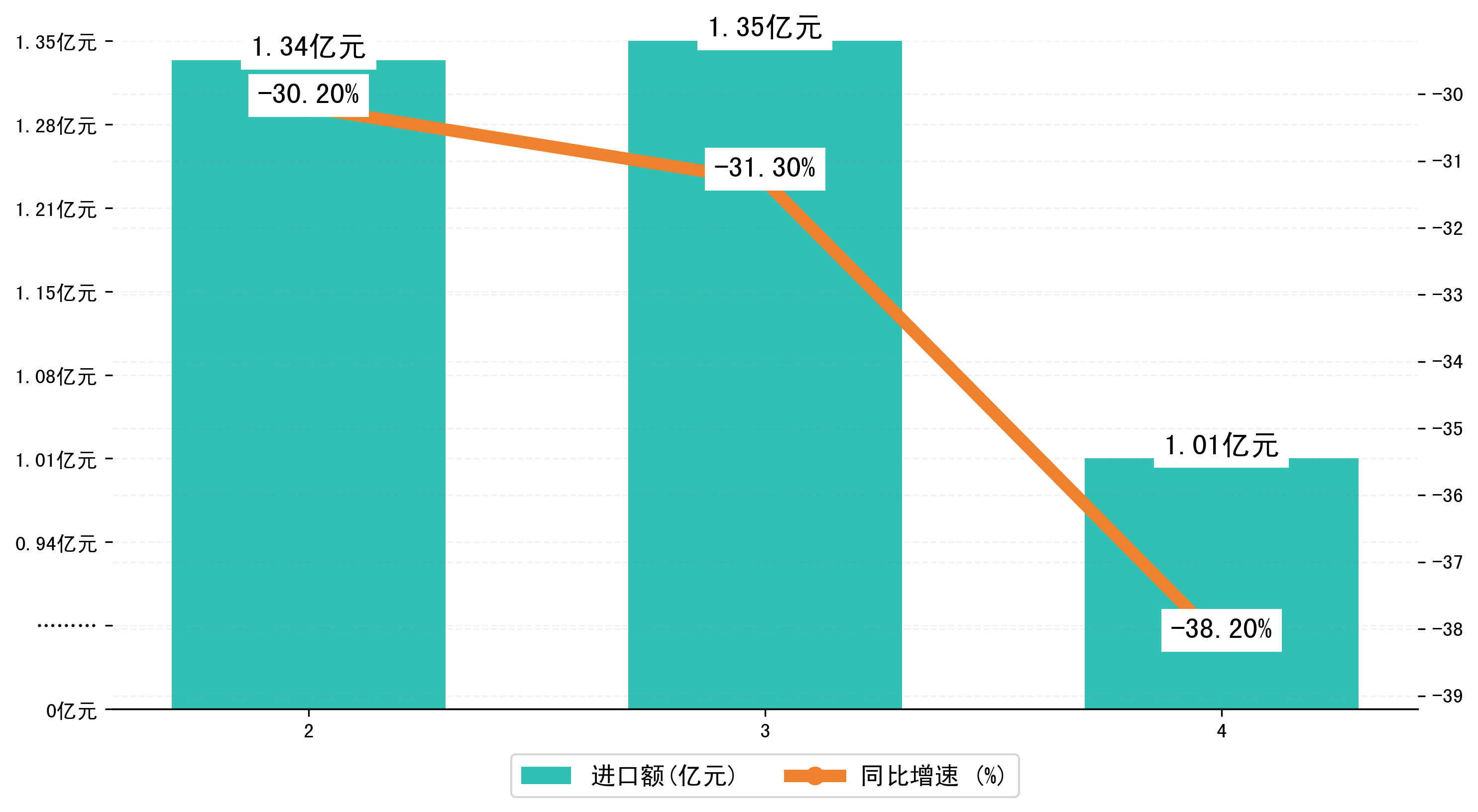 以人民币计,2025年1-4月榆林市进口额为5,7475.0493万元,相比上年同期减少了3,6315.039万元,同比减少了-38.20%。