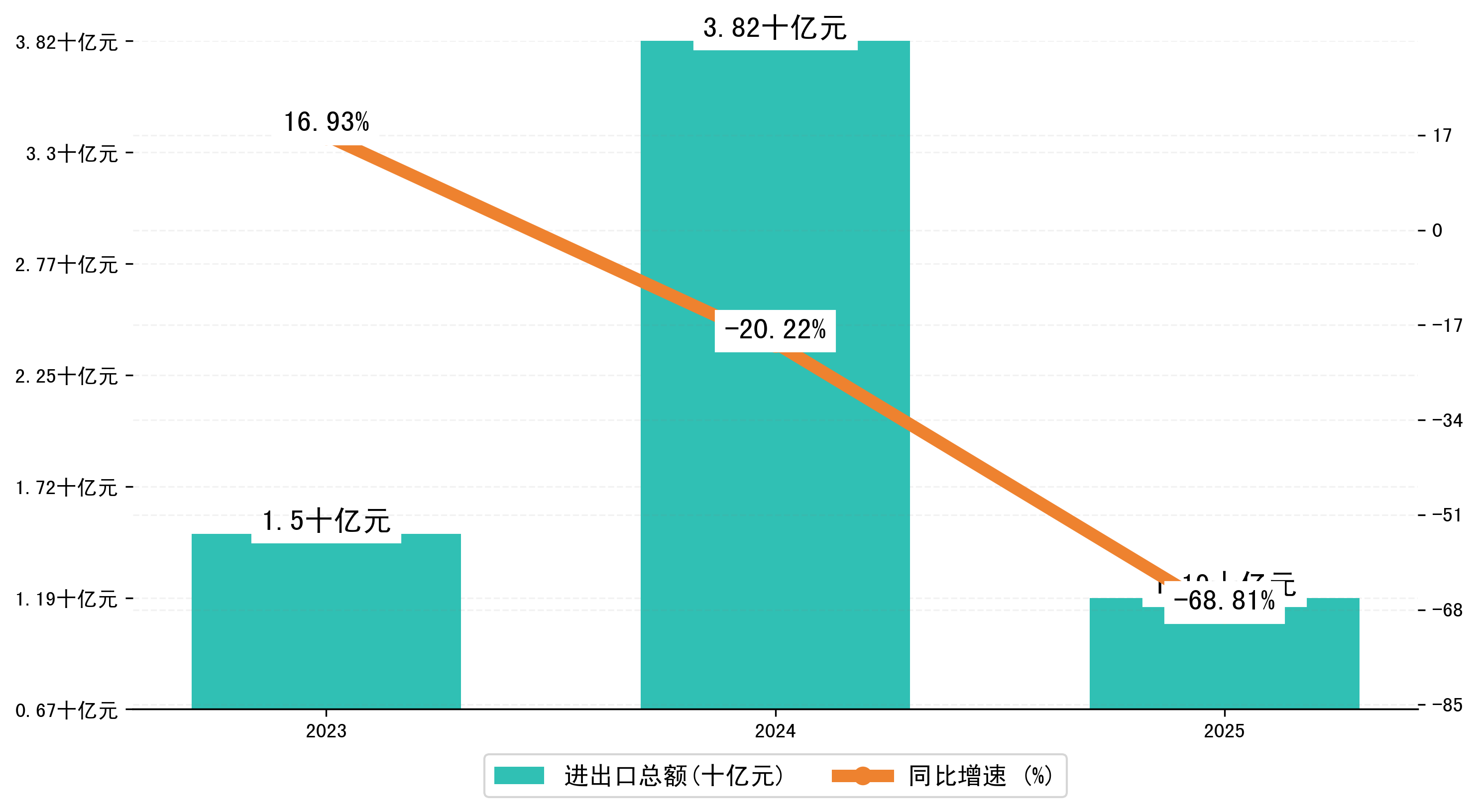 以美元计,2025年1-4月榆林市贸易差额为640,1921万美元(贸易顺差),相比上年同期减少了2,6763,5162万美元,同比减少-97.66%。