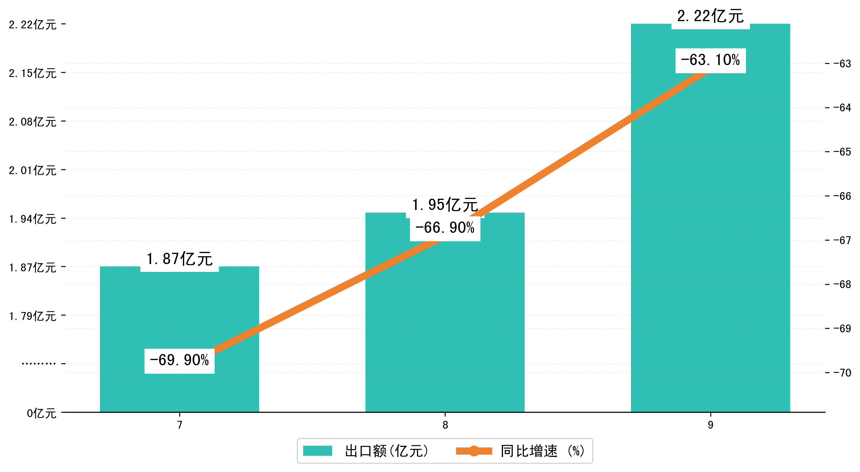 以人民币计,2025年1-9月榆林市出口额为15,3574.0831万元,相比上年同期减少了26,2177.866万元,同比减少了-63.10%。