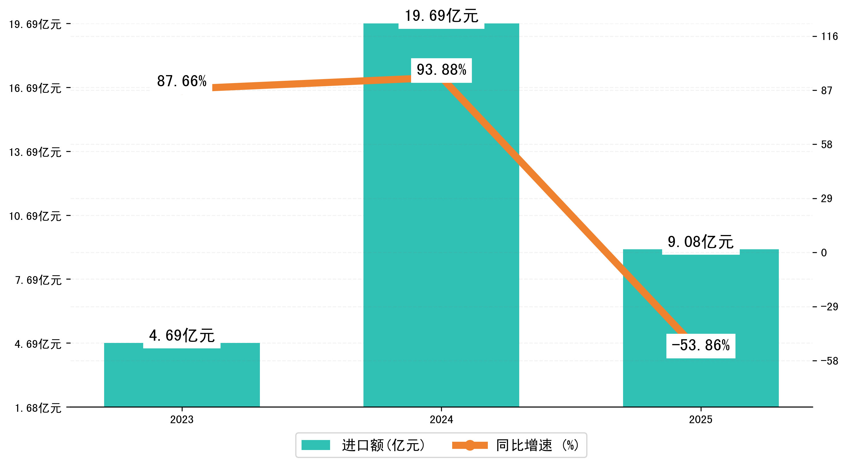 以人民币计,2025年1-9月榆林市进口额为9,0833.439万元,相比上年同期减少了10,6037.2714万元,同比减少了-53.70%。