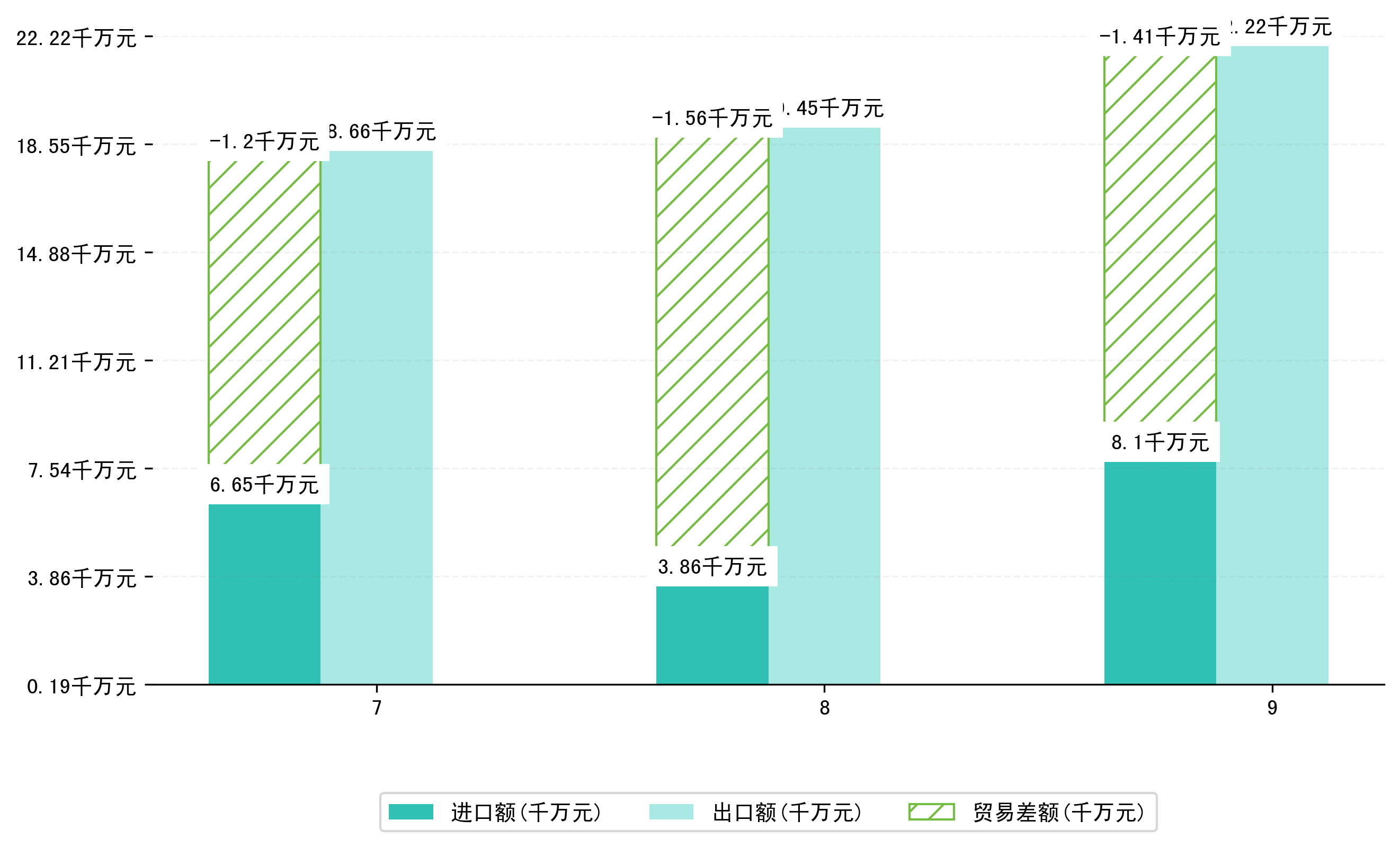 以人民币计,2025年9月榆林市贸易差额为1,4120,7718万元(贸易顺差),相比上月减少了1468,4617万元,即202,1993万美元;相比上年同期增加了1,1709,4287万元,同比增加485.6%。