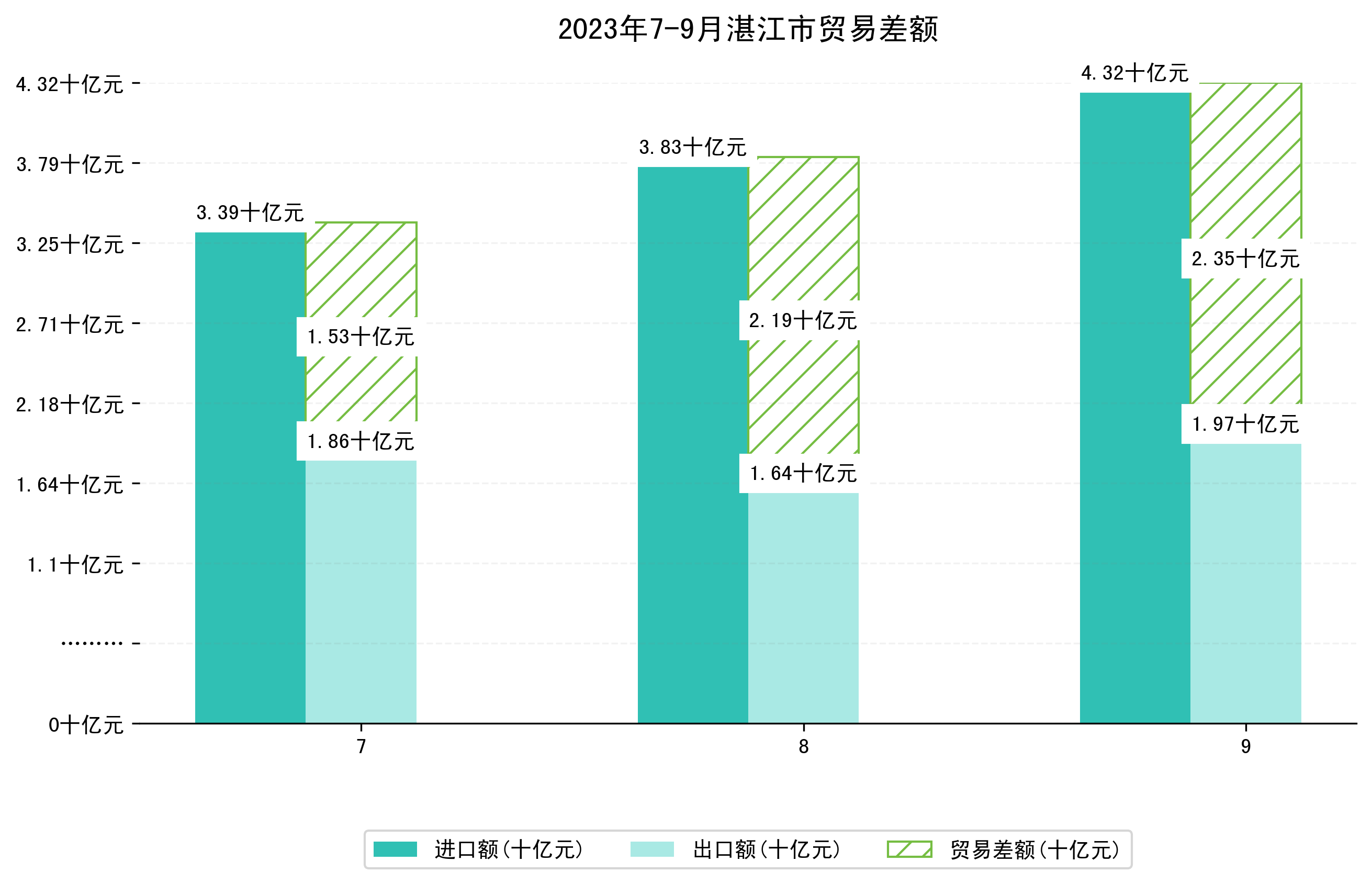 以人民币计,2023年1-9月湛江市贸易差额为176,6891,3411万元(贸易逆差),相比上年同期增加了193,3081万元,同比增加-0.01%。