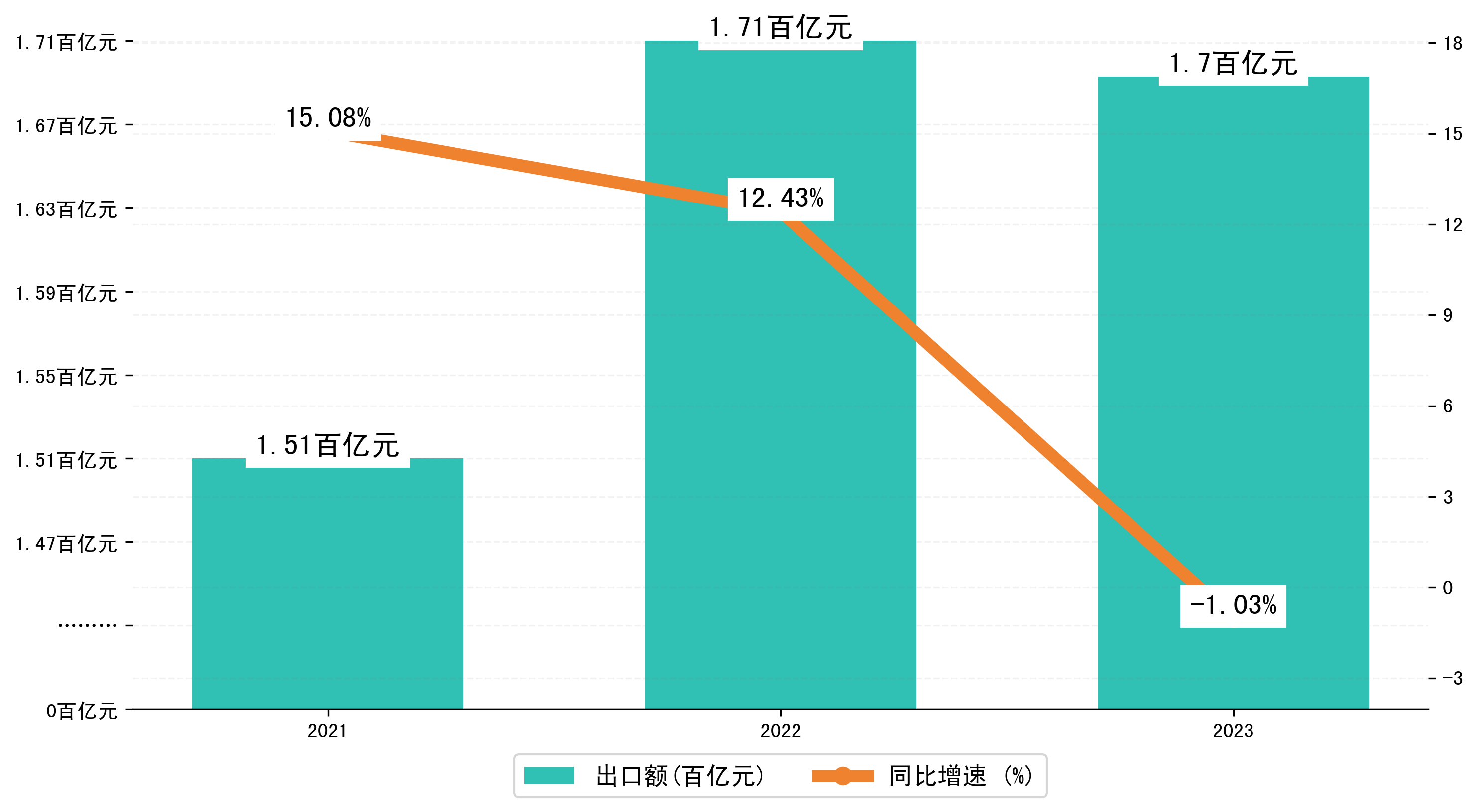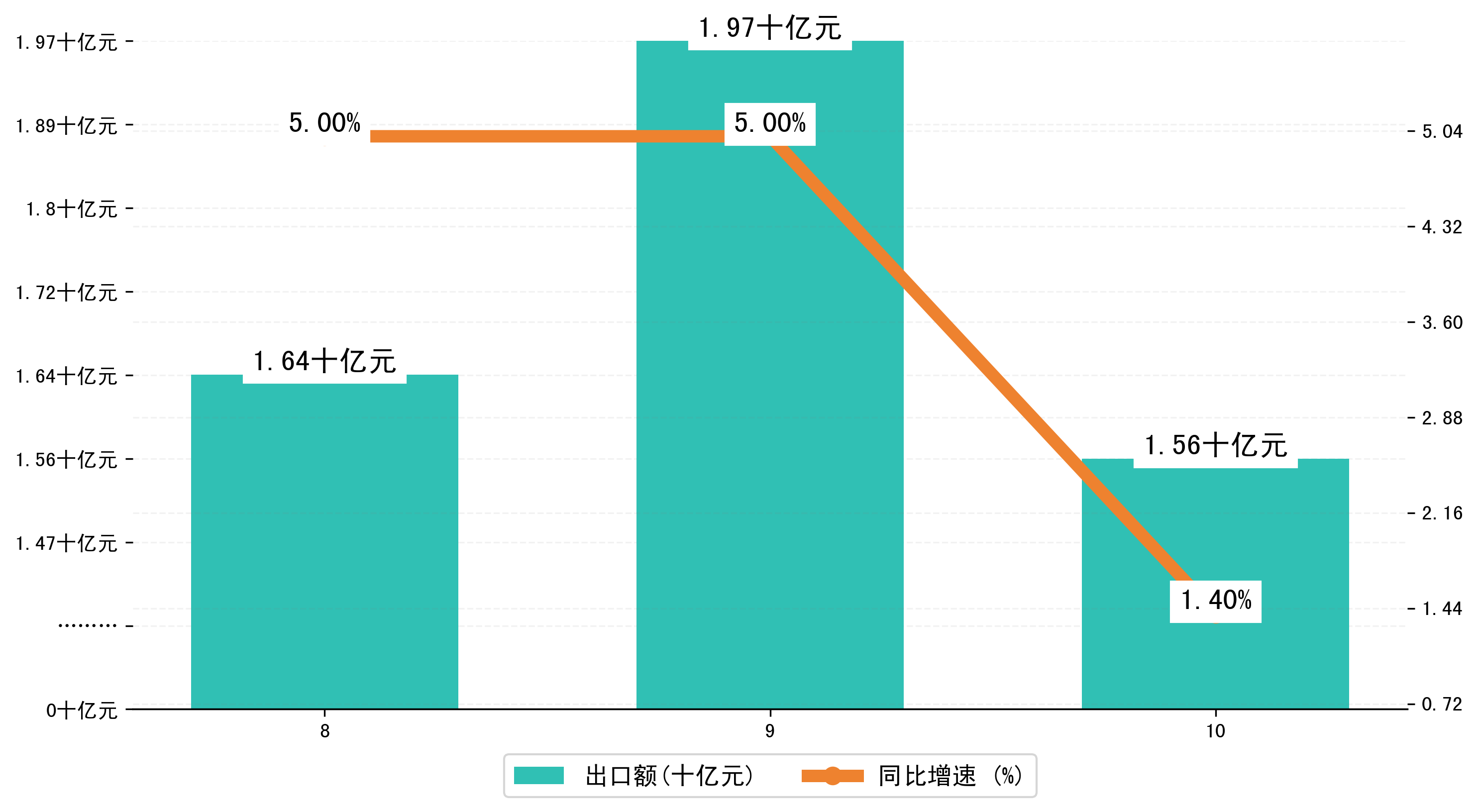 以人民币计,2023年1-10月湛江市出口额为169,6772.6551万元,相比上年同期减少了1,7572.1967万元,同比增加了1.40%。