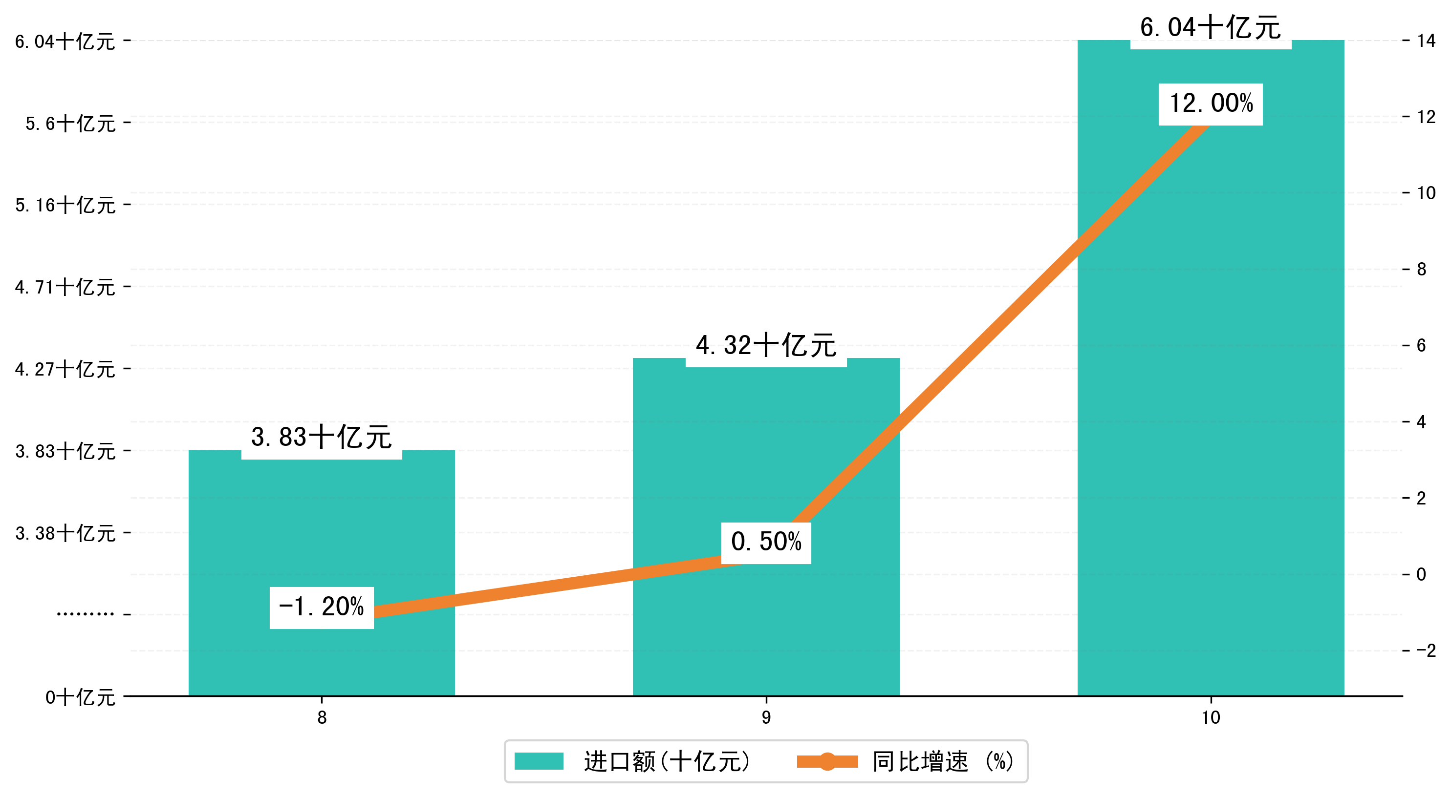 以人民币计,2023年1-10月湛江市进口额为397,3158.0211万元,相比上年同期增加了44,2555.0257万元,同比增加了12.00%。