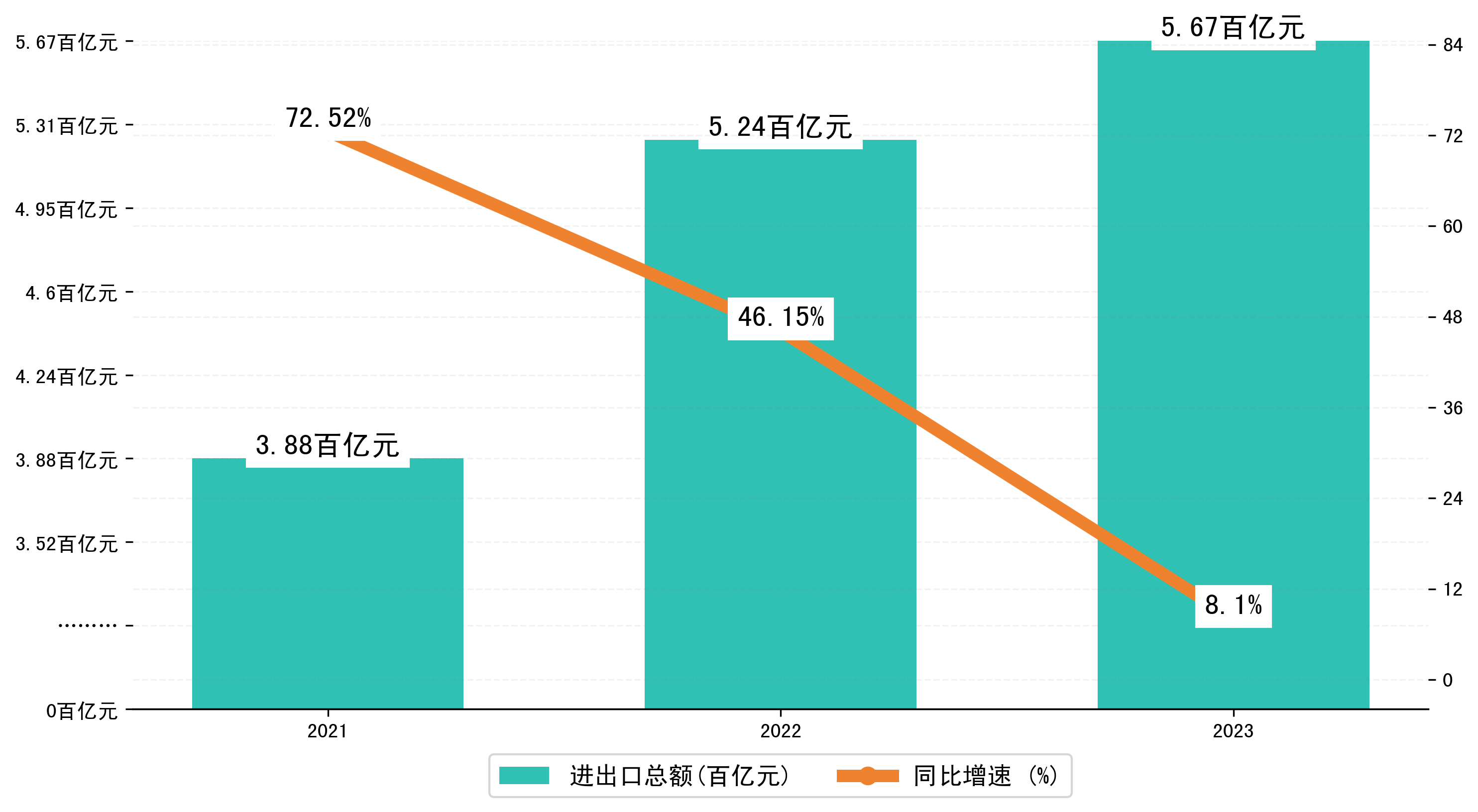以美元计,2023年1-10月湛江市进出口总额为81,0044.9087万美元,相比上年同期增加了1,1109.0088万美元,同比增加1.80%。