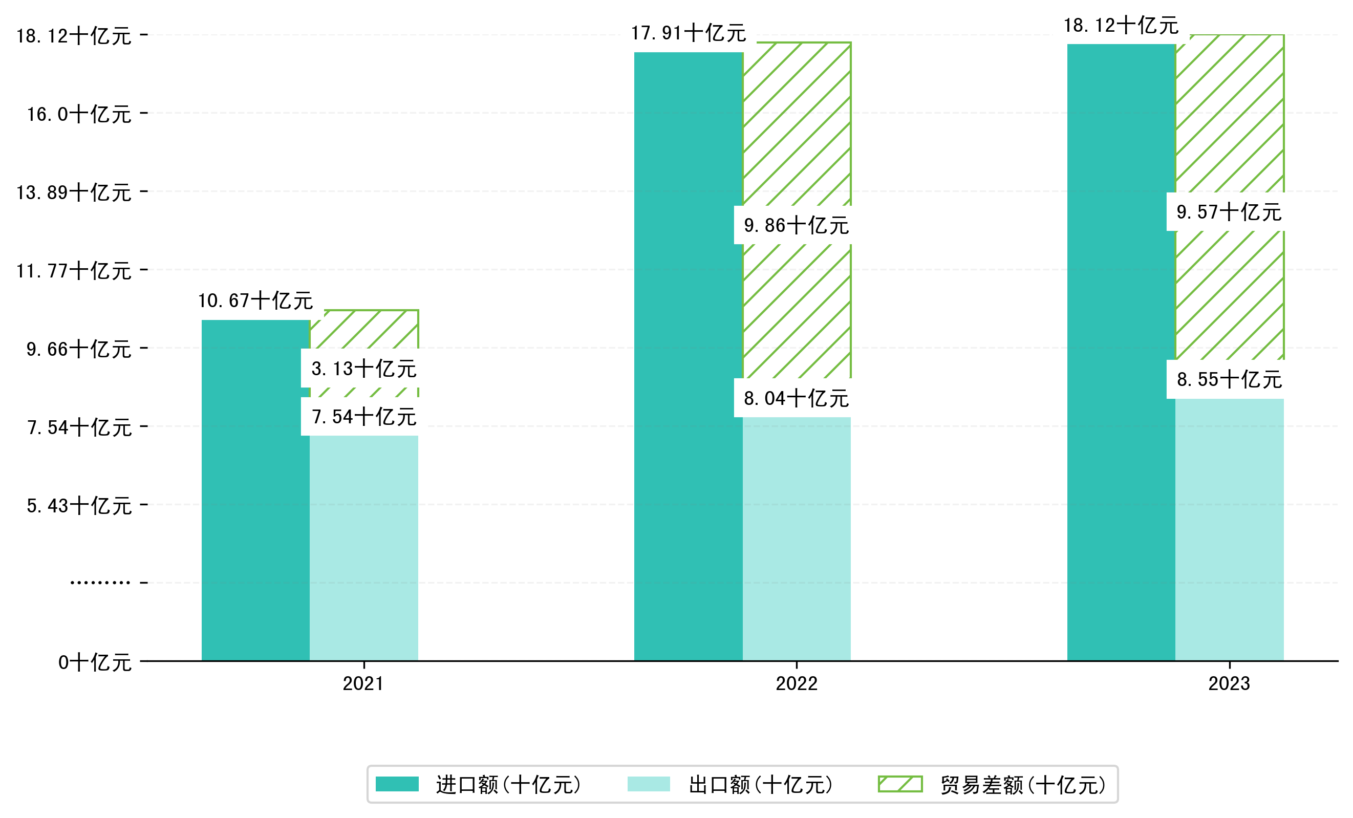 以美元计,2023年1-5月湛江市贸易差额为13,9706,9684万美元(贸易逆差),相比上年同期增加了1,4801,2765万美元,同比增加-9.58%。