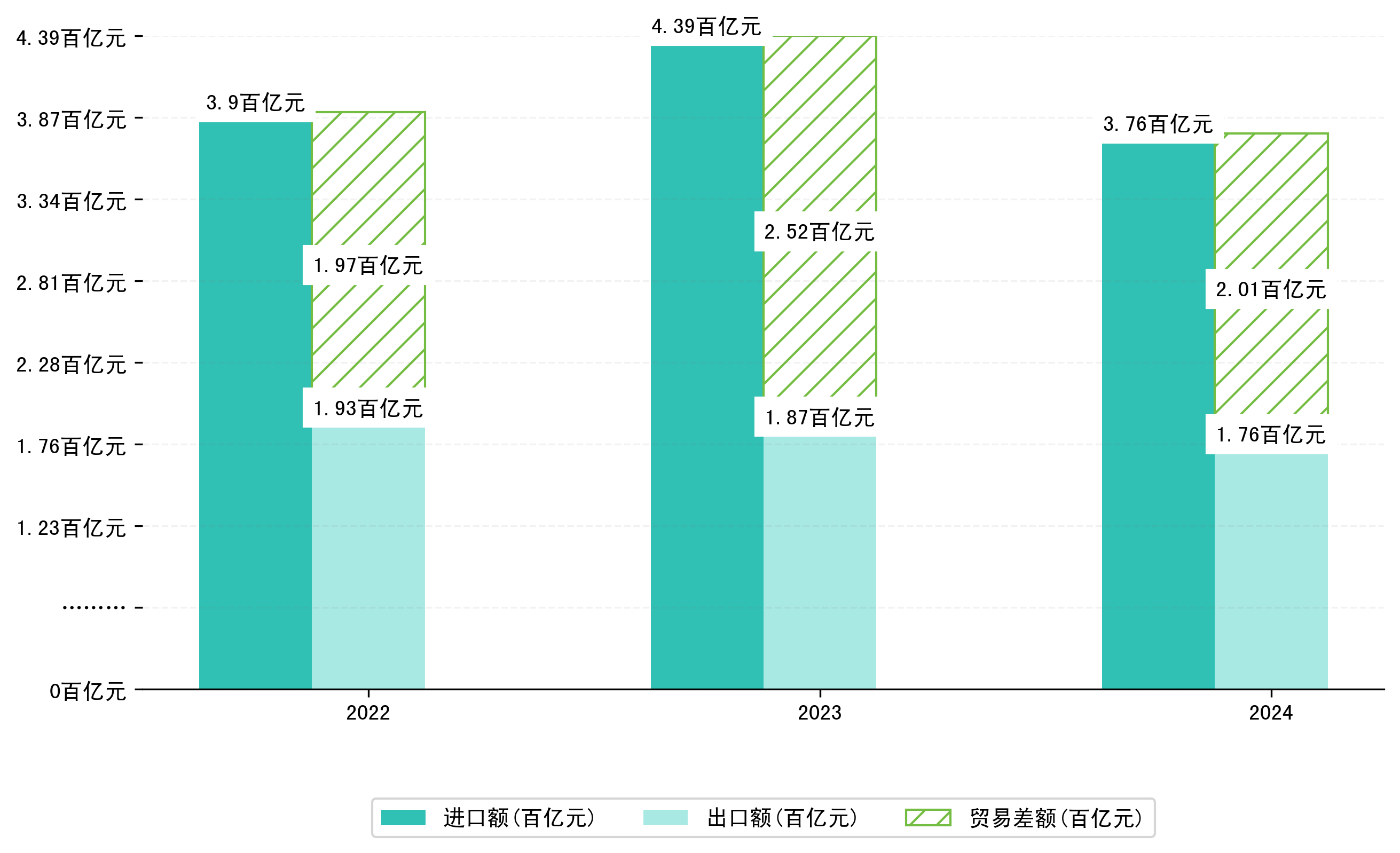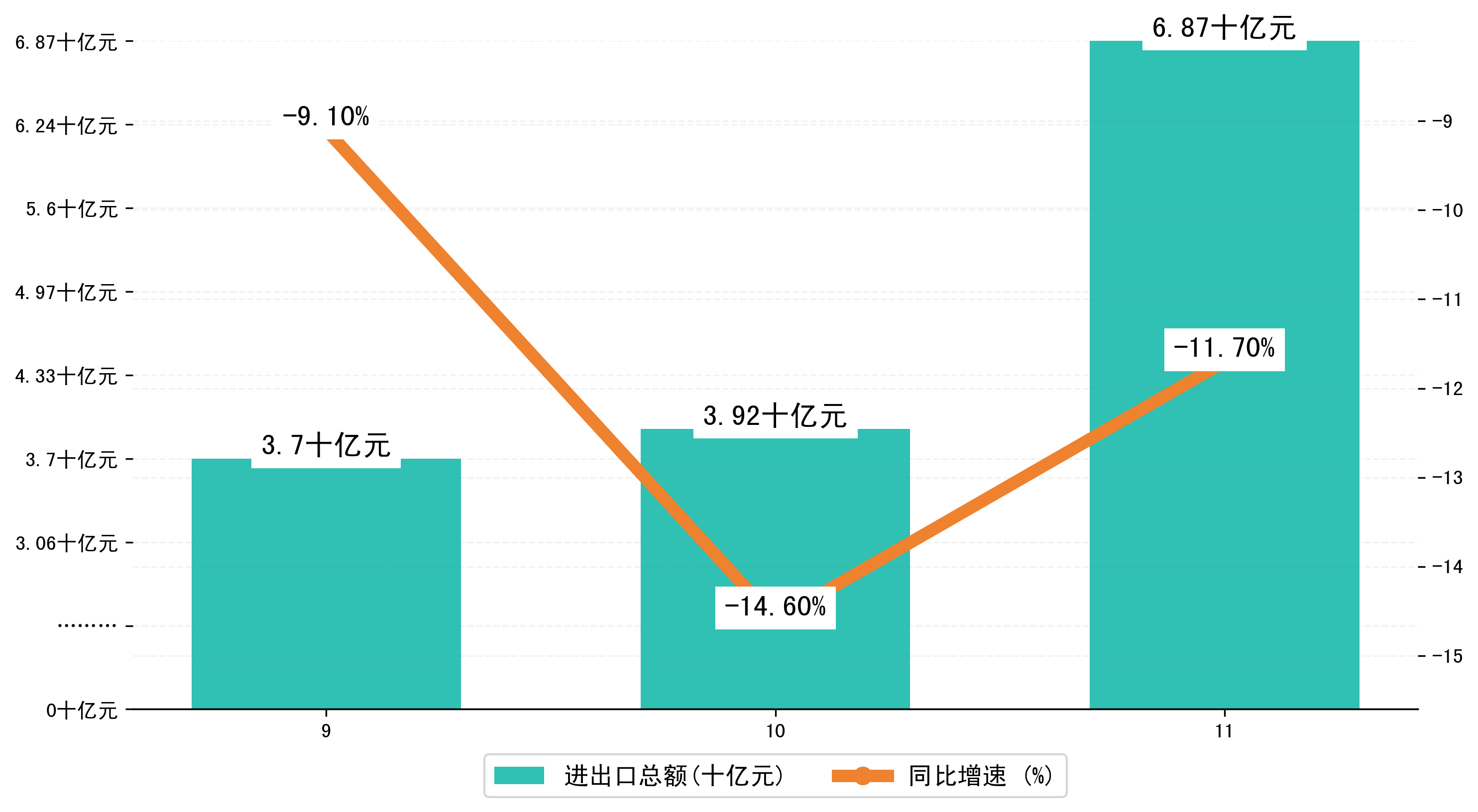 以人民币计,2024年11月湛江市贸易差额为33,5695,9760万元(贸易逆差),相比上月减少了30,0058,4063万元,即4,2070,5194万美元;相比上年同期减少了8,3538,3755万元,同比减少33.13%。