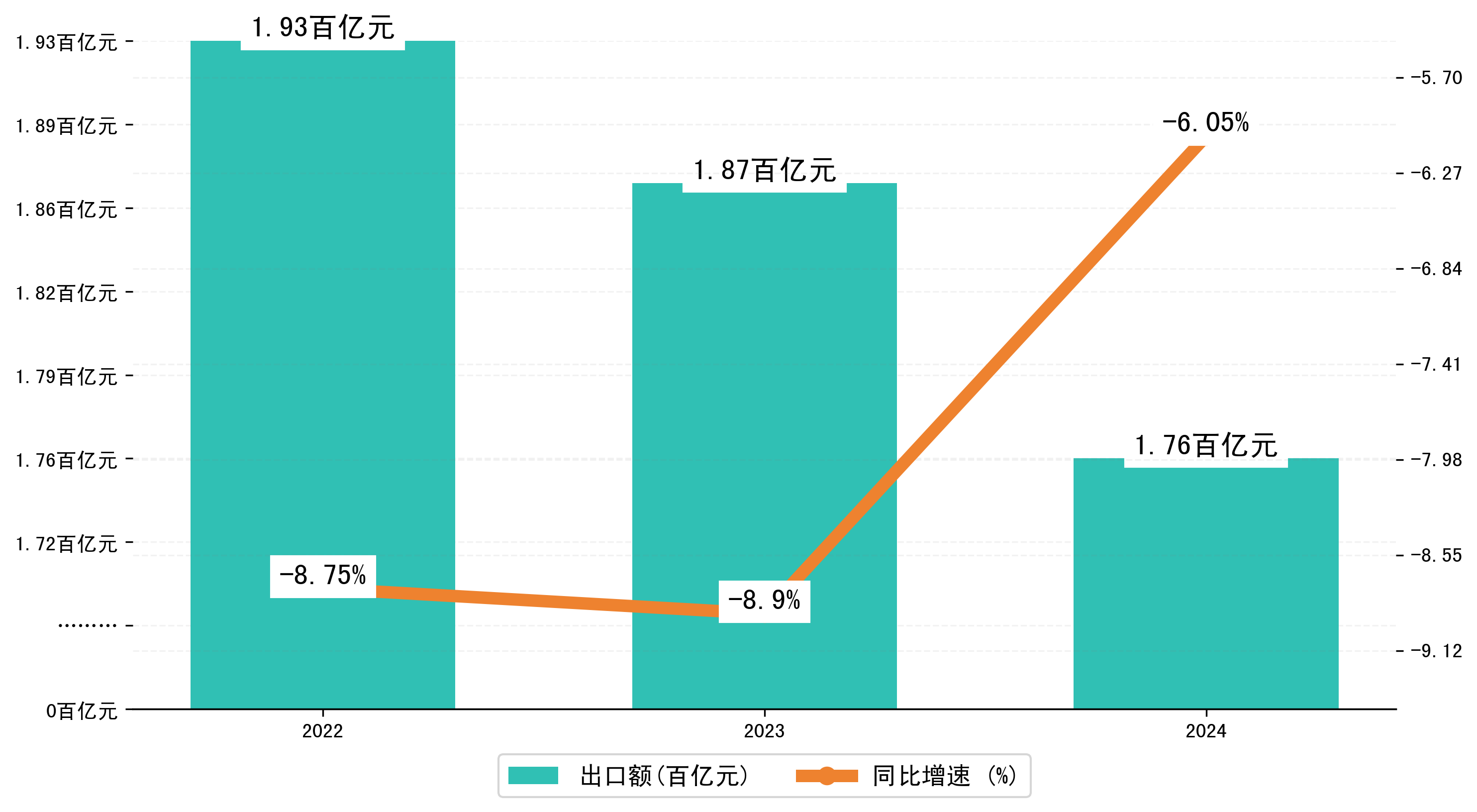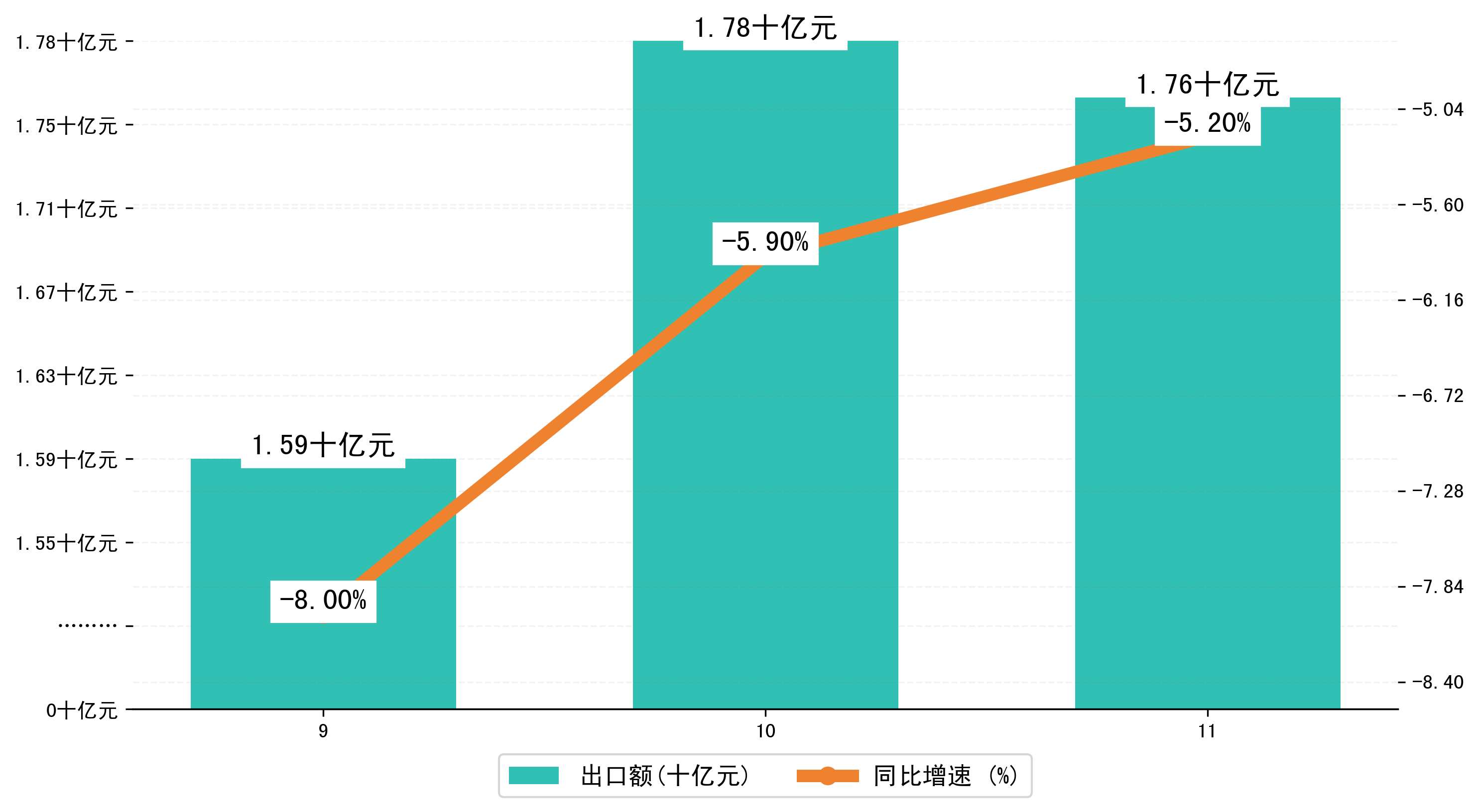以人民币计,2024年1-11月湛江市出口额为175,6359.8471万元,相比上年同期减少了11,3003.6728万元,同比减少了-5.20%。