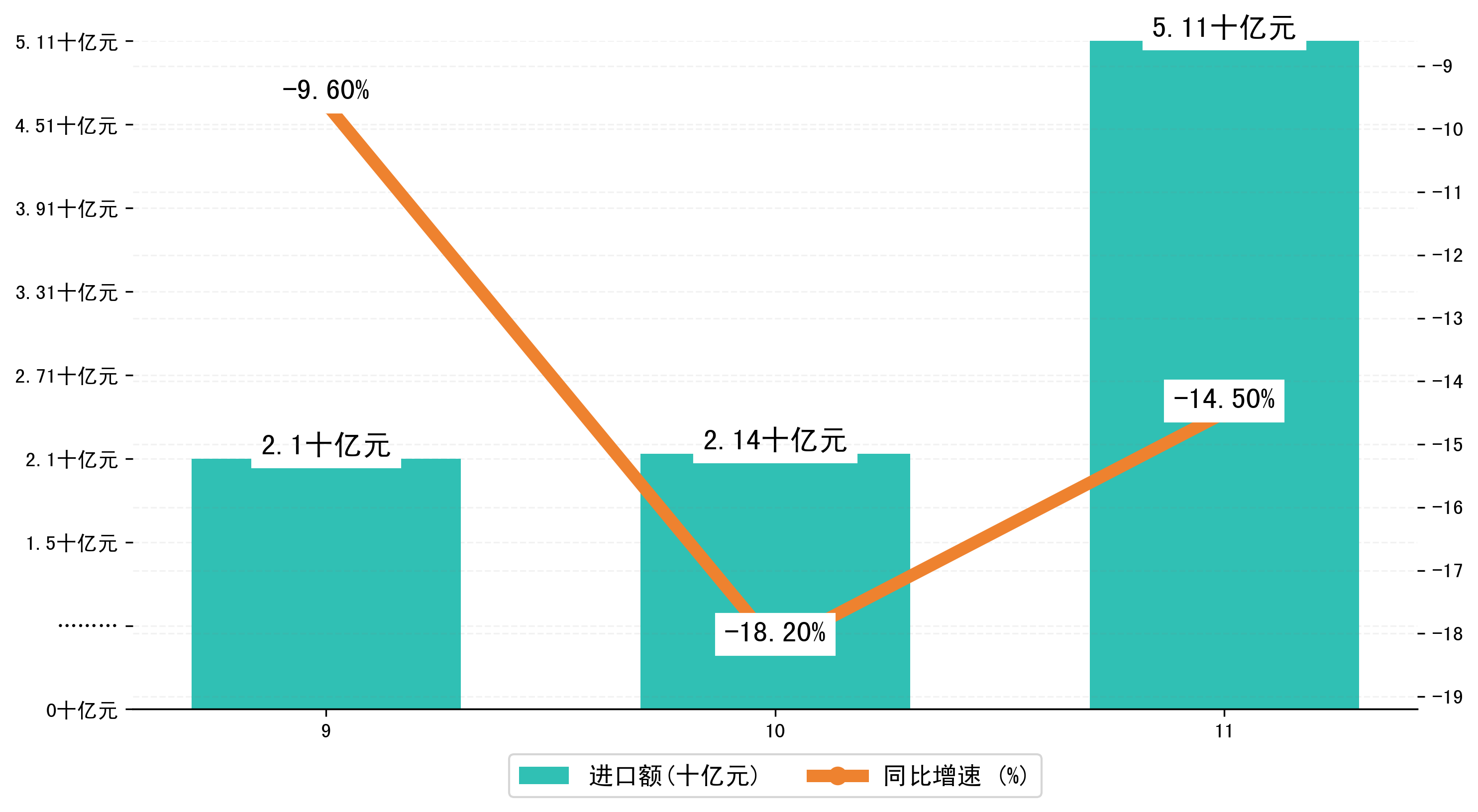 以人民币计,2024年11月湛江市进口额为51,1477.4799万元,相比上月增加了29,7473.2108万元;相比上年同期增加了8,6482.9362万元,同比减少了-14.50%。