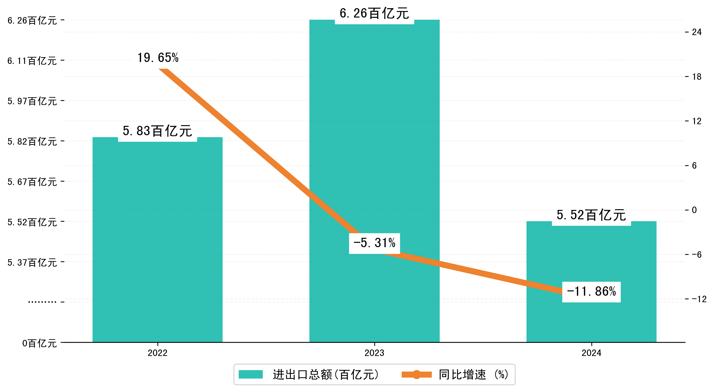 以人民币计,2024年1-11月湛江市进出口总额为551,9867.7669万元,相比上年同期减少了74,2455.2571万元,同比减少了-11.70%。