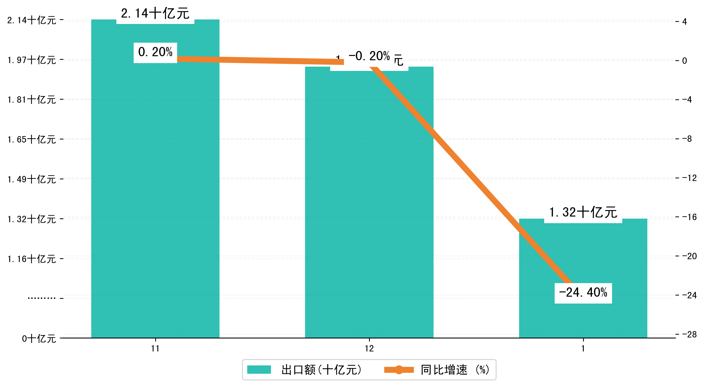以美元计,2023年1-1月湛江市出口额为1,8981.5324万美元,相比上年同期减少了8489.5515万美元,同比减少-30.90%。