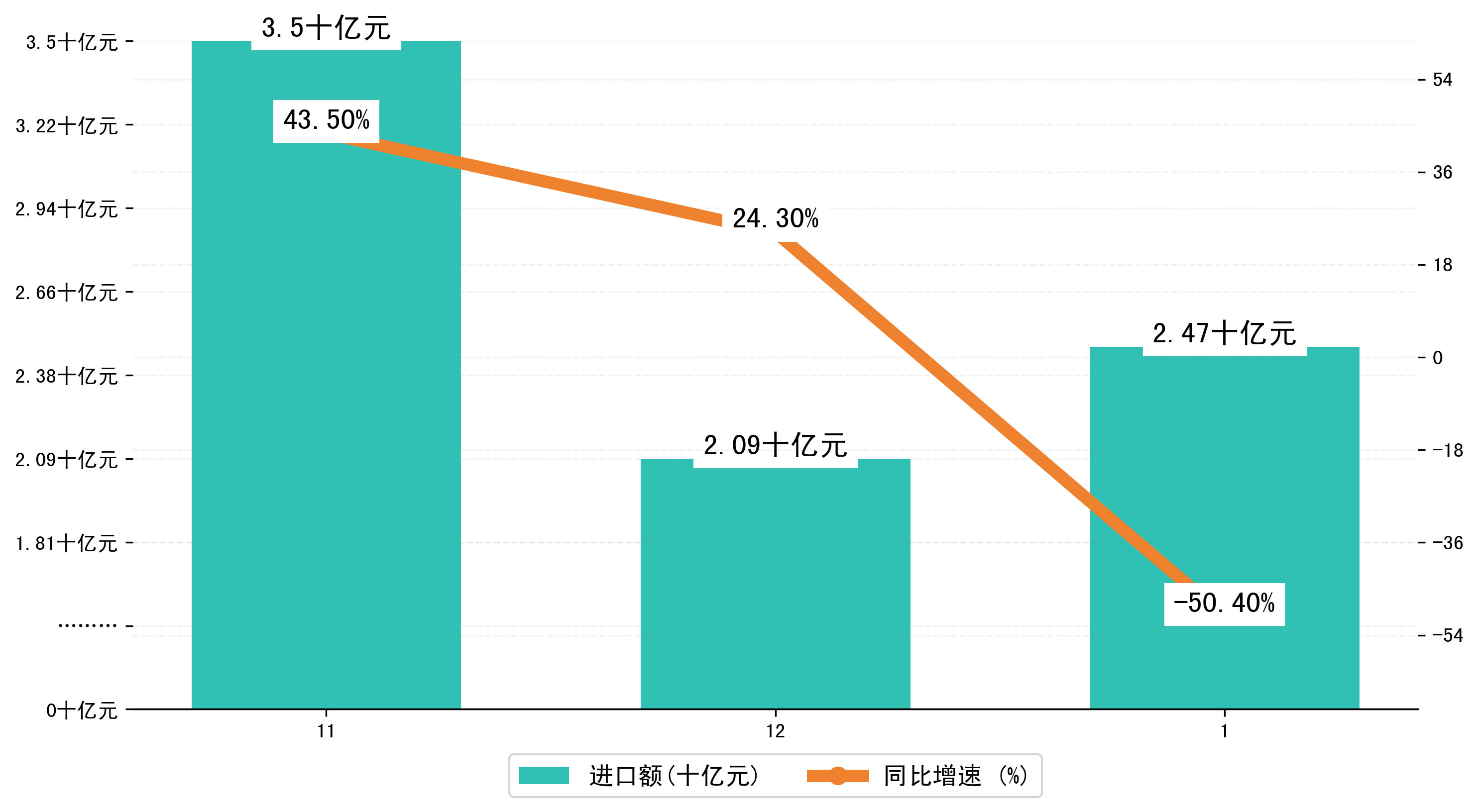 以人民币计,2023年1-1月湛江市进口额为24,7132.6863万元,相比上年同期减少了24,0053.4339万元,同比减少了-50.40%。