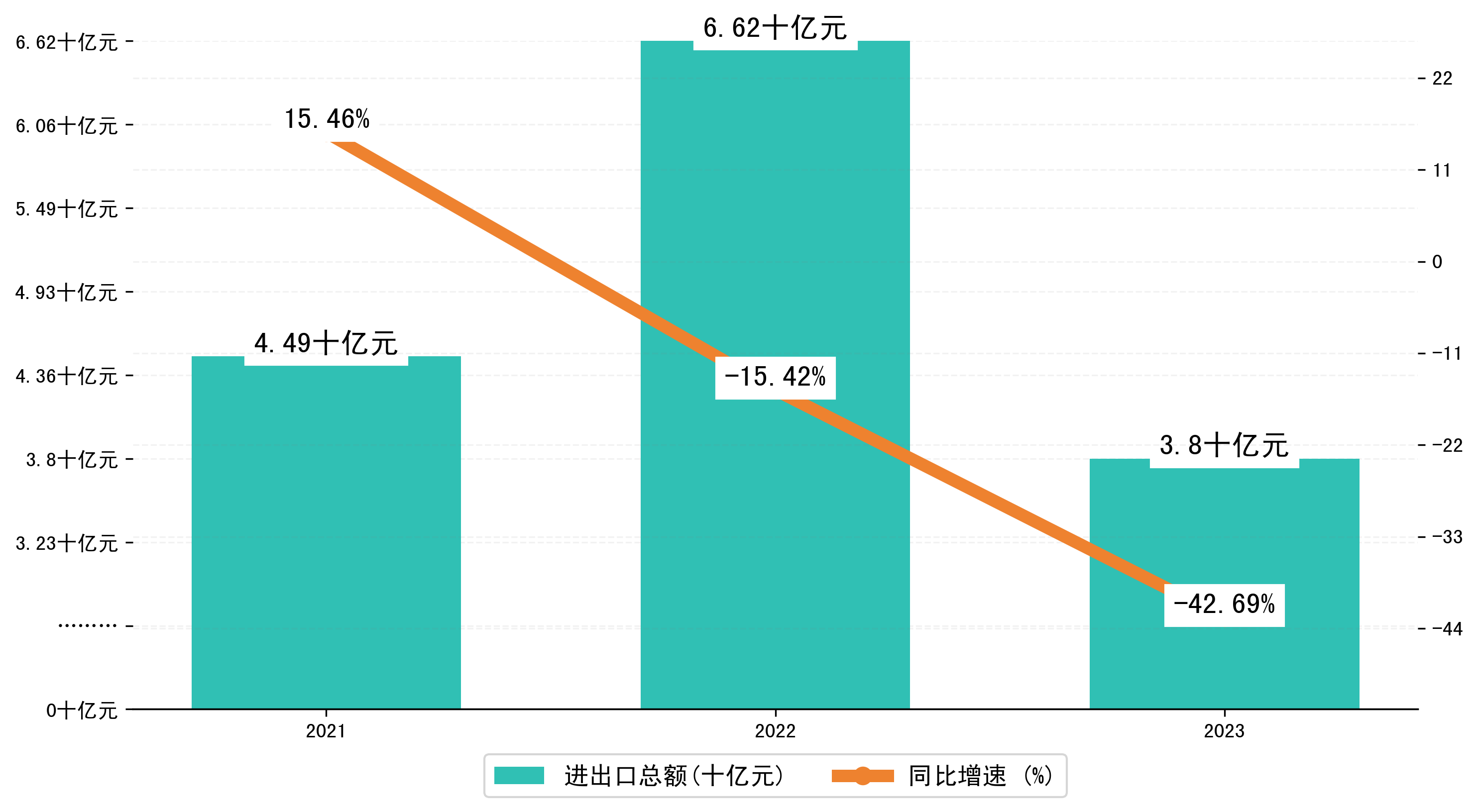 以人民币计,2023年1月湛江市进出口总额为37,9583.6748万元,相比上月减少了2,4167.0093万元;相比上年同期减少了28,2797.489万元,同比减少了-43.70%。