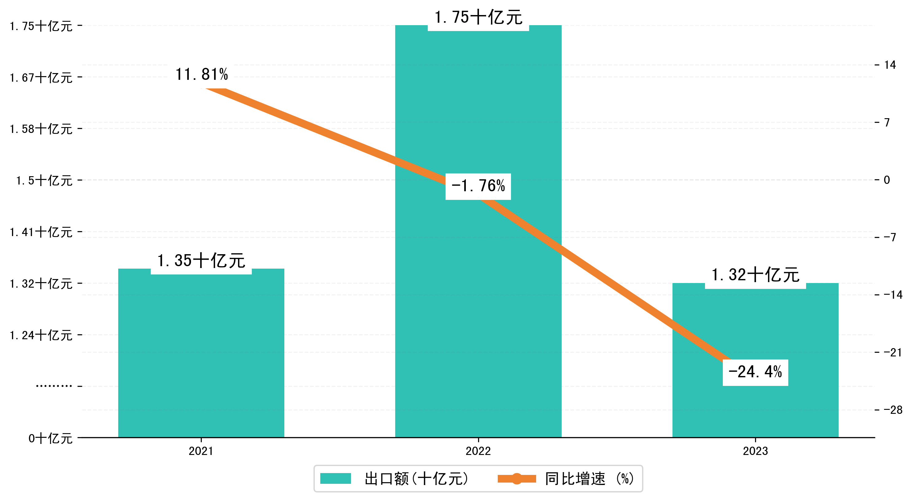 以人民币计,2023年1-1月湛江市出口额为13,2450.9885万元,相比上年同期减少了4,2744.0551万元,同比减少了-24.40%。