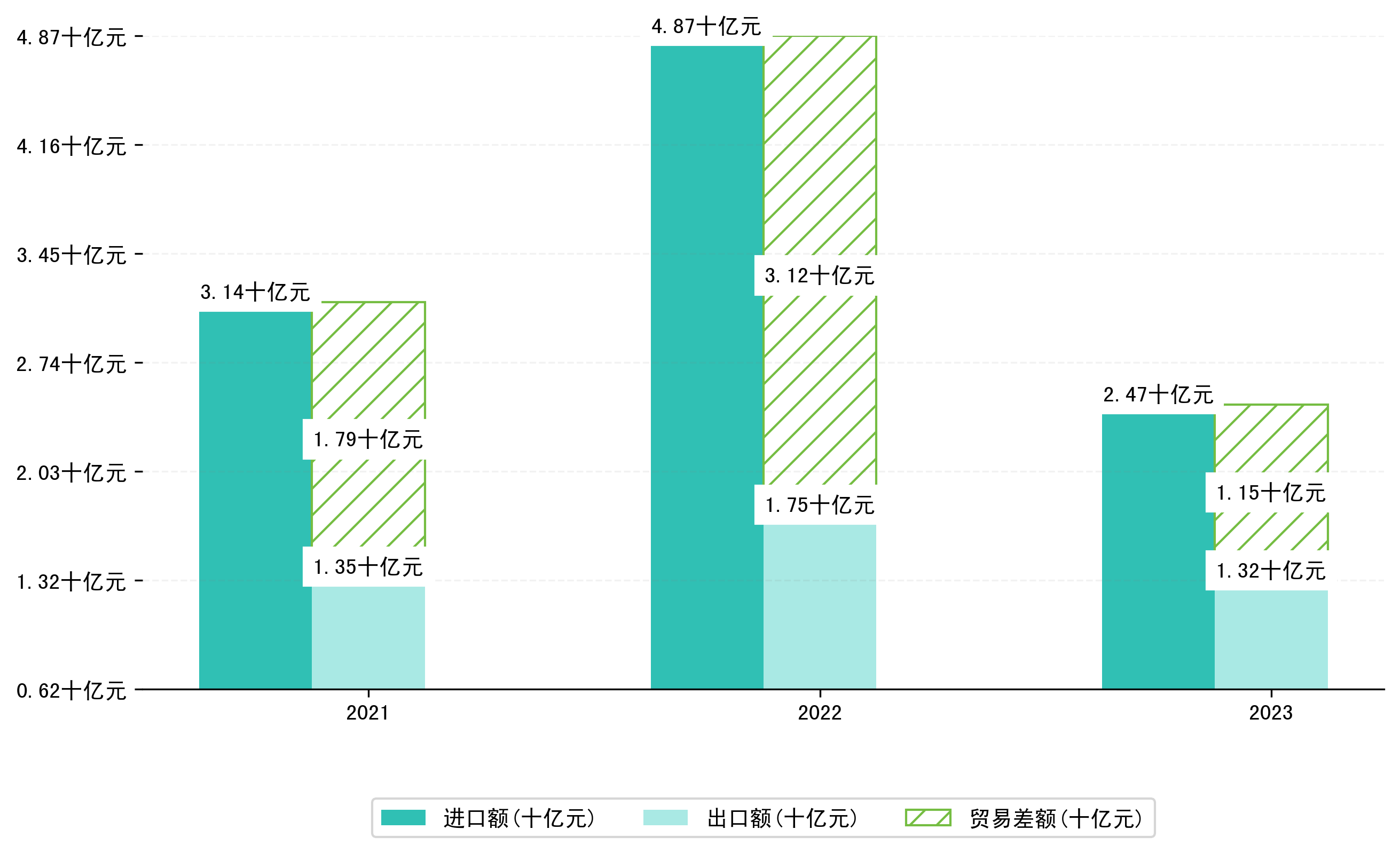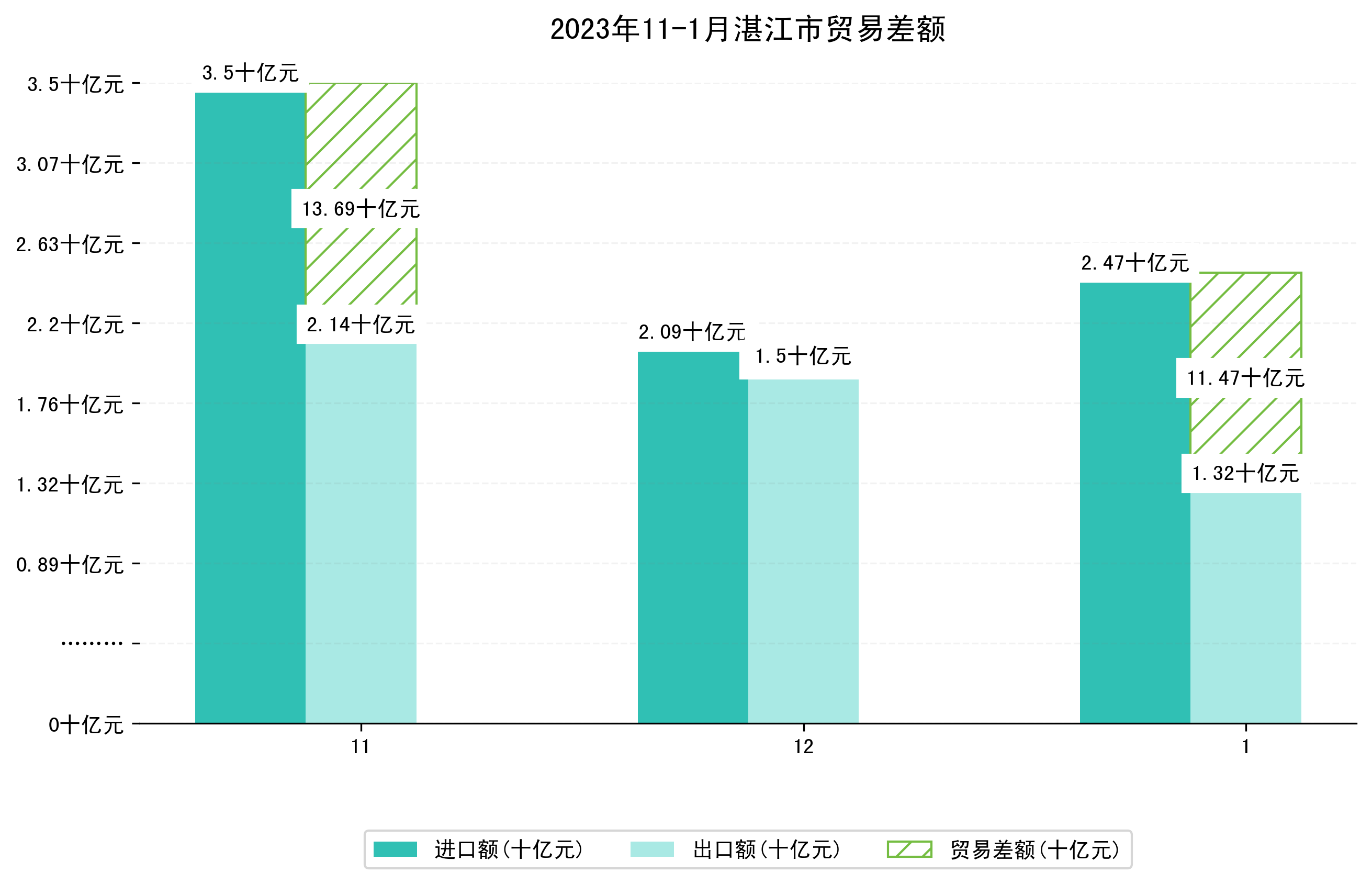 以美元计,2023年1-1月湛江市贸易差额为1,6423,0685万美元(贸易逆差),相比上年同期增加了3,2530,8373万美元,同比增加-66.45%。