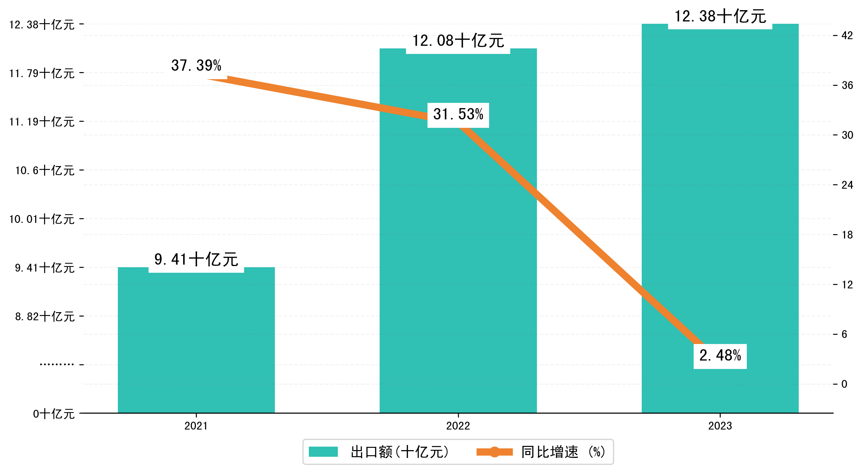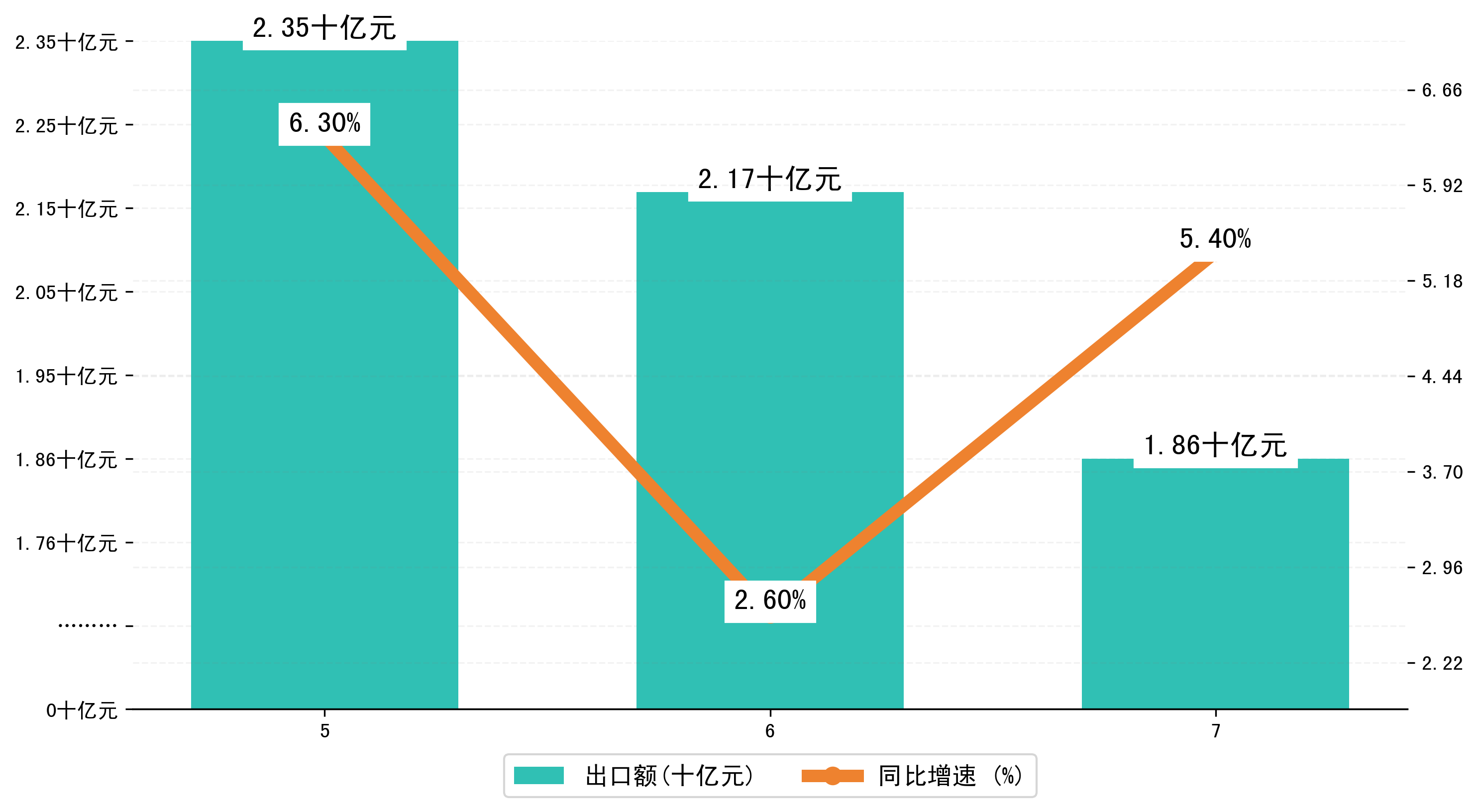 以人民币计,2023年1-7月湛江市出口额为123,8210.8035万元,相比上年同期增加了2,9936.2084万元,同比增加了5.40%。