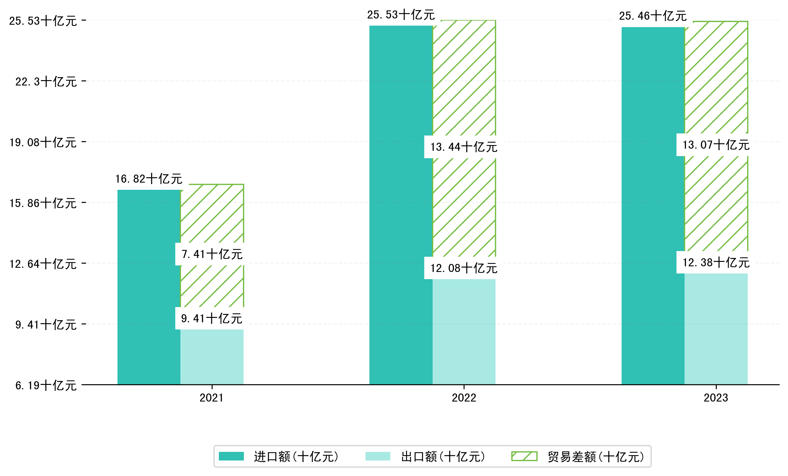 以美元计,2023年1-7月湛江市贸易差额为18,9386,9736万美元(贸易逆差),相比上年同期增加了1,8109,4644万美元,同比增加-8.73%。