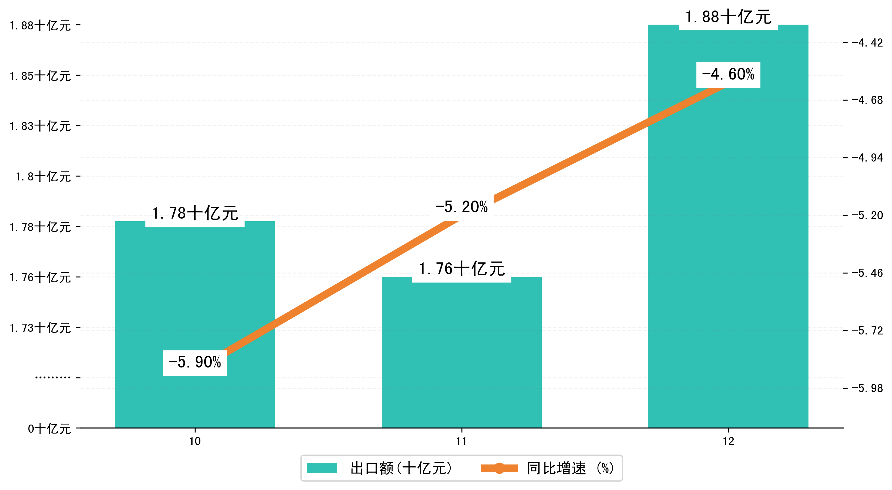 以人民币计,2024年12月湛江市出口额为18,7505.1298万元,相比上月增加了1,1723.6259万元;相比上年同期增加了4091.8759万元,同比减少了-4.60%。