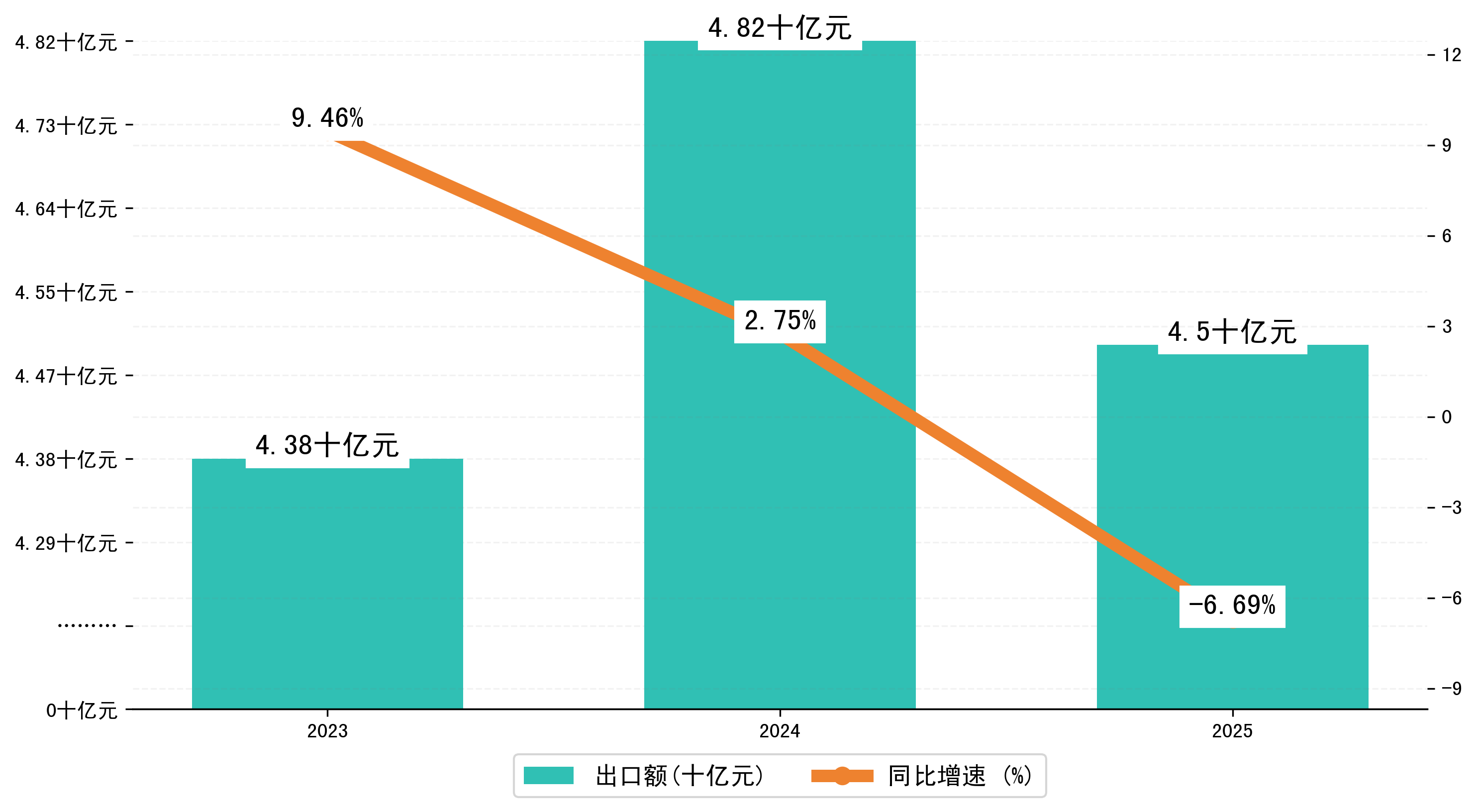 以人民币计,2025年1-3月湛江市出口额为44,9791.4513万元,相比上年同期减少了3,2245.5575万元,同比减少了-6.70%。