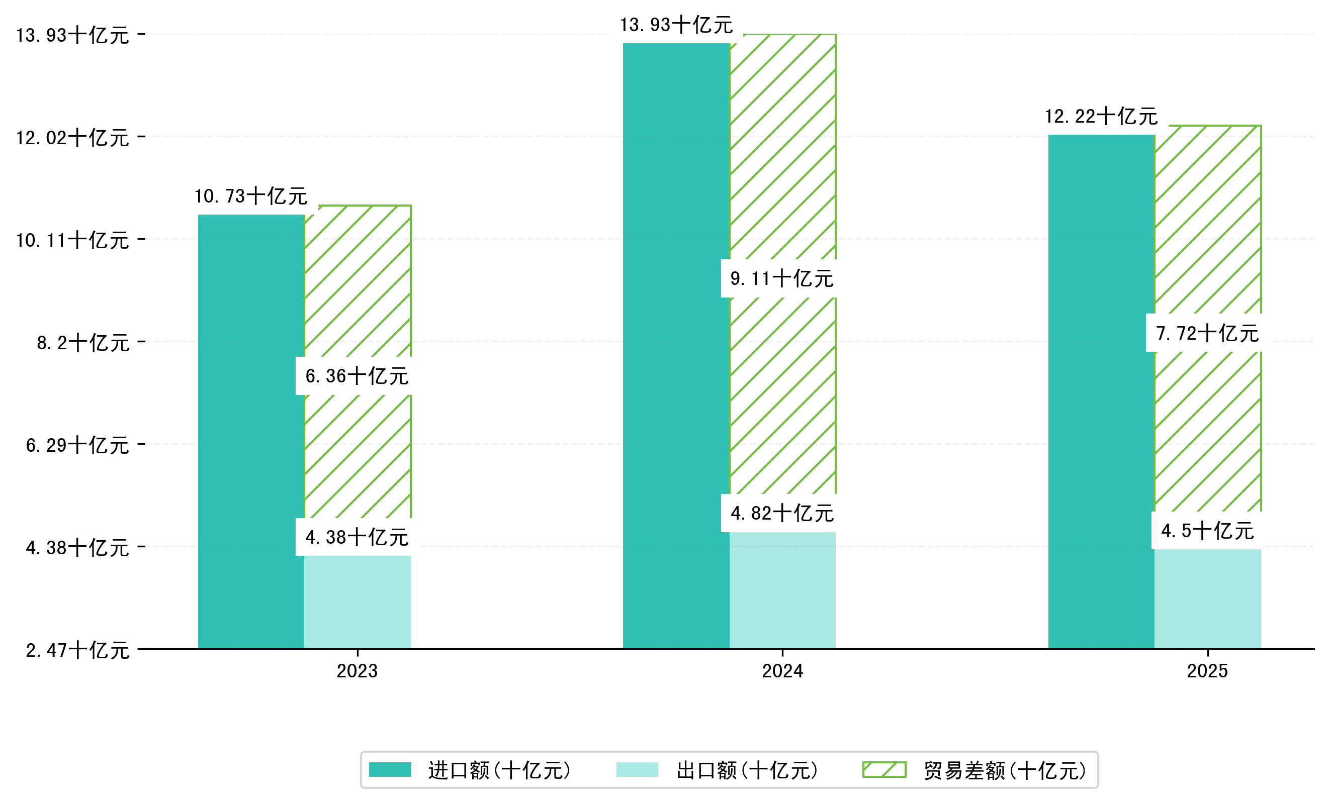 以美元计,2025年1-3月湛江市贸易差额为10,7456,9891万美元(贸易逆差),相比上年同期增加了2,0684,9886万美元,同比增加-16.14%。