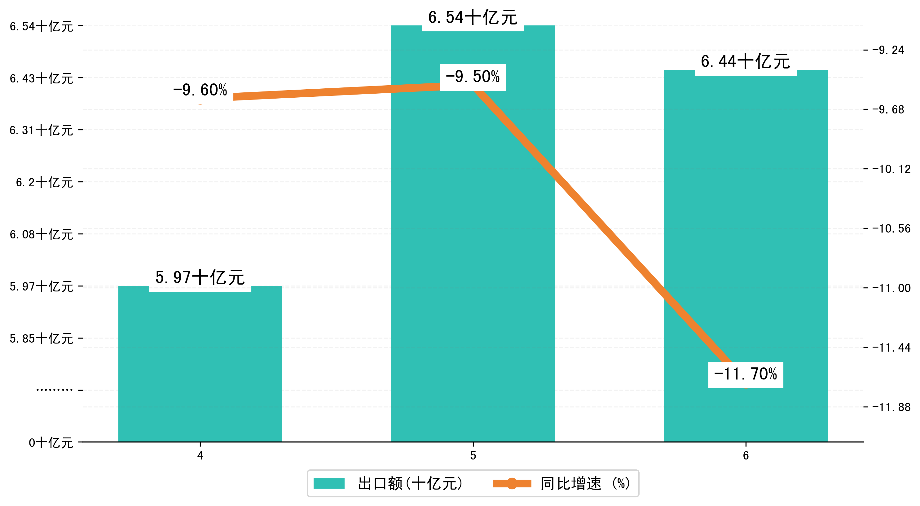 以美元计,2025年1-6月海南省出口额为55,9691.8369万美元,相比上年同期减少了8,1112.8397万美元,同比减少-12.70%。