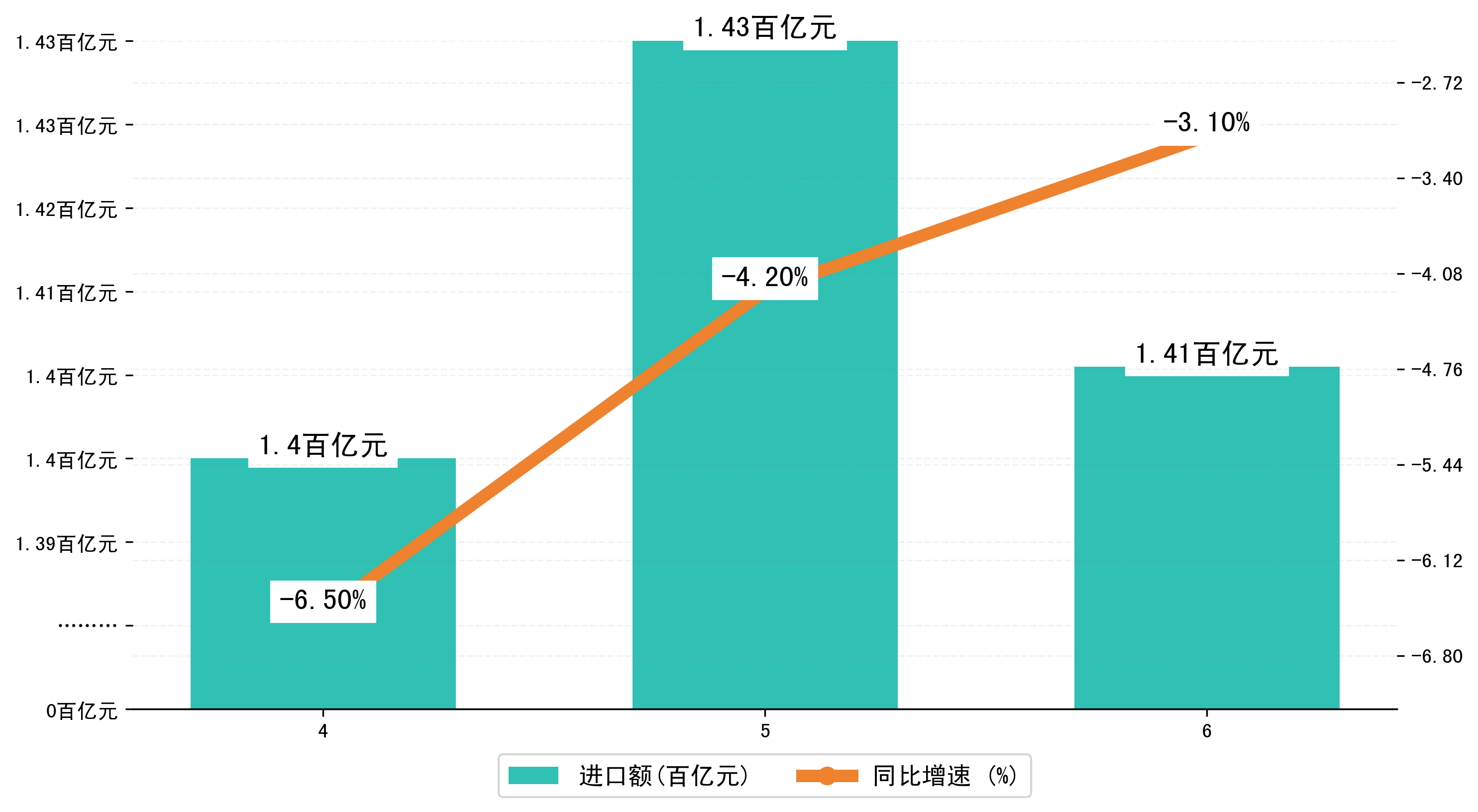 以人民币计,2025年6月海南省进口额为140,5038.5378万元,相比上月减少了2,7605.663万元;相比上年同期增加了3,5332.3105万元,同比减少了-3.10%。