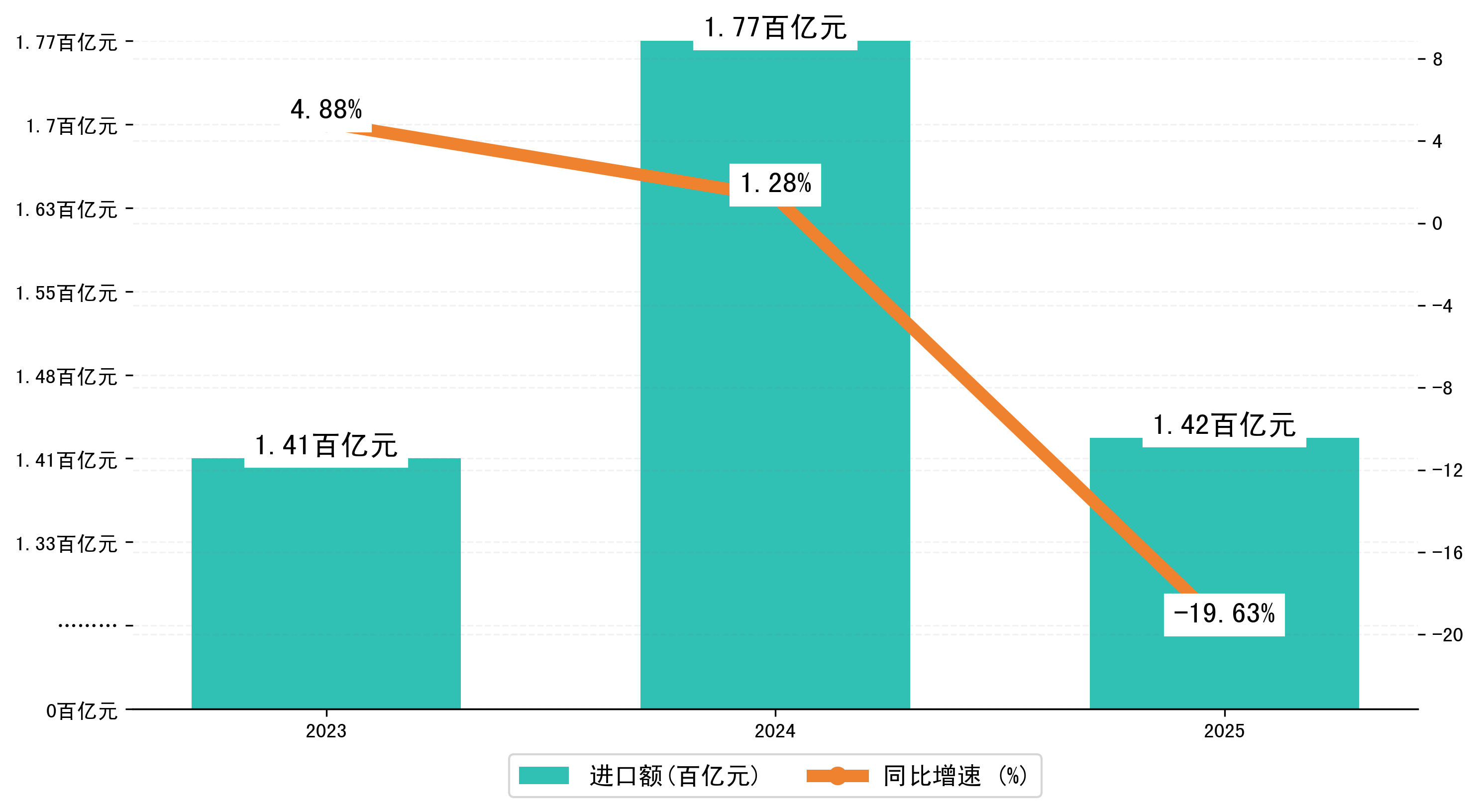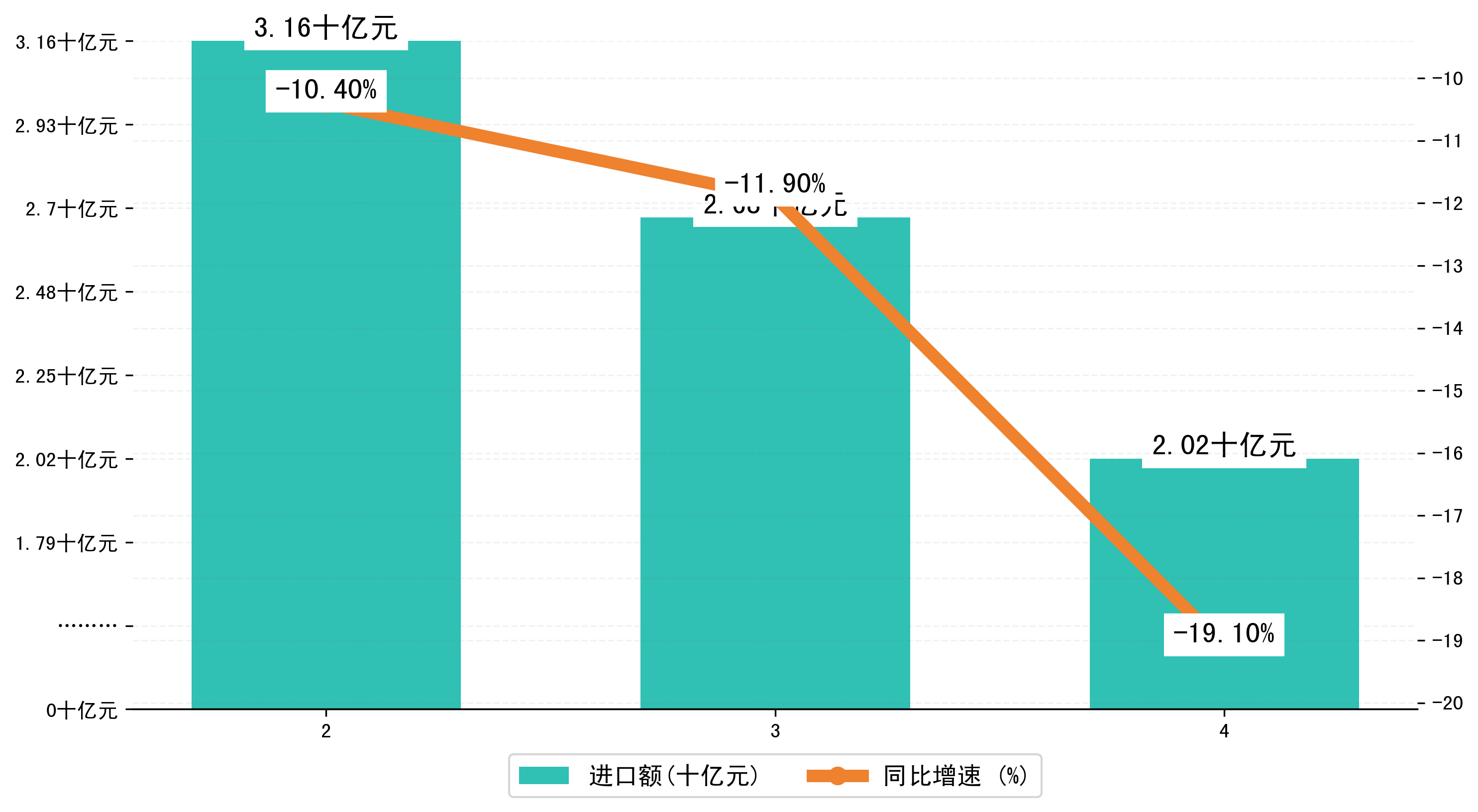 以人民币计,2025年4月湛江市进口额为20,1952.0407万元,相比上月减少了6,5841.8468万元;相比上年同期减少了17,7273.0812万元,同比减少了-19.10%。