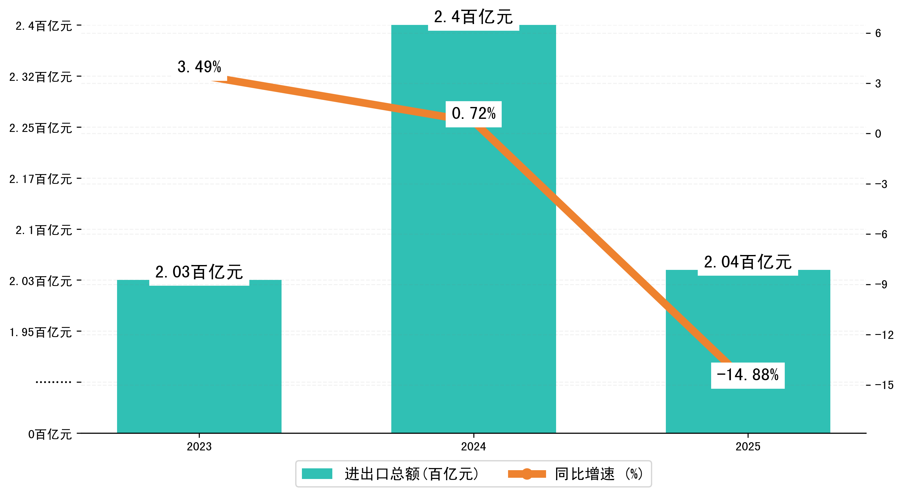 以人民币计,2025年1-4月湛江市进出口总额为204,0337.1934万元,相比上年同期减少了35,6655.3864万元,同比减少了-14.50%。