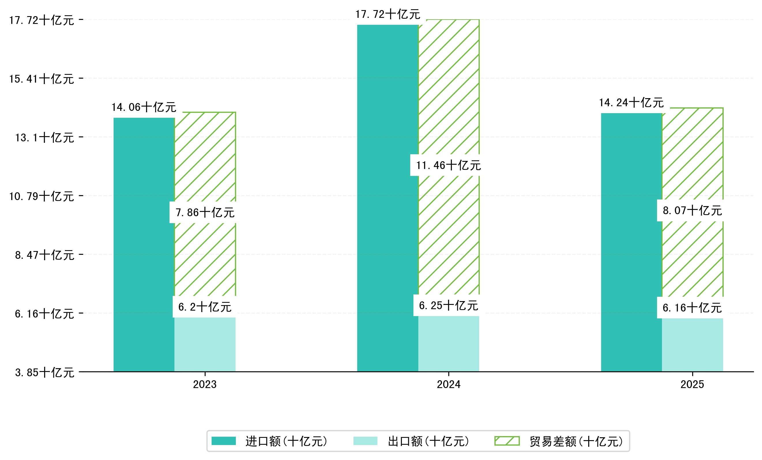 以人民币计,2025年4月湛江市贸易差额为3,5269,0129万元(贸易逆差),相比上月增加了5,6695,9786万元,即7909,5762万美元;相比上年同期增加了20,0601,4146万元,同比增加-85.05%。