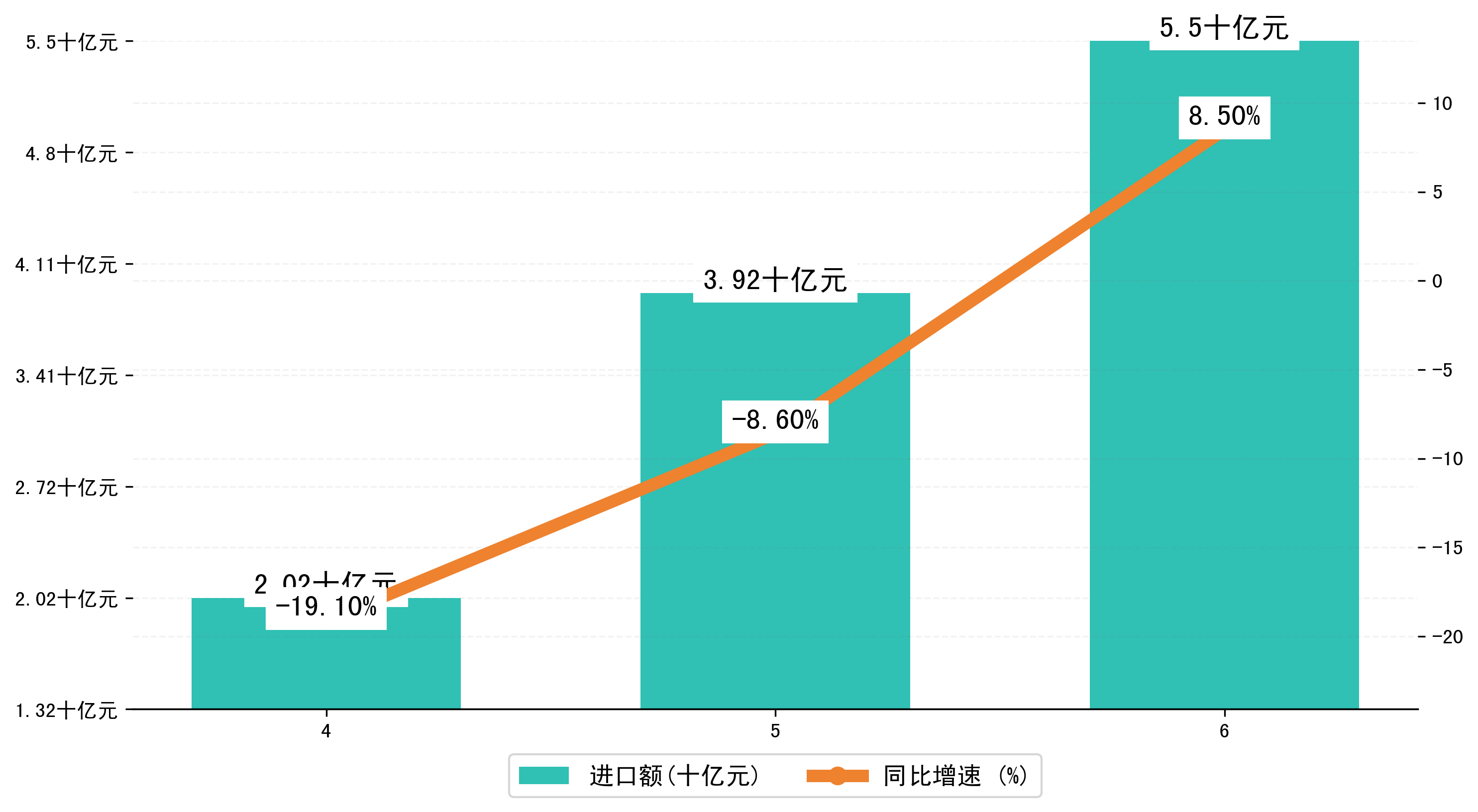 以人民币计,2025年6月湛江市进口额为54,9787.2585万元,相比上月增加了15,7597.5829万元;相比上年同期增加了35,4344.7994万元,同比增加了8.50%。