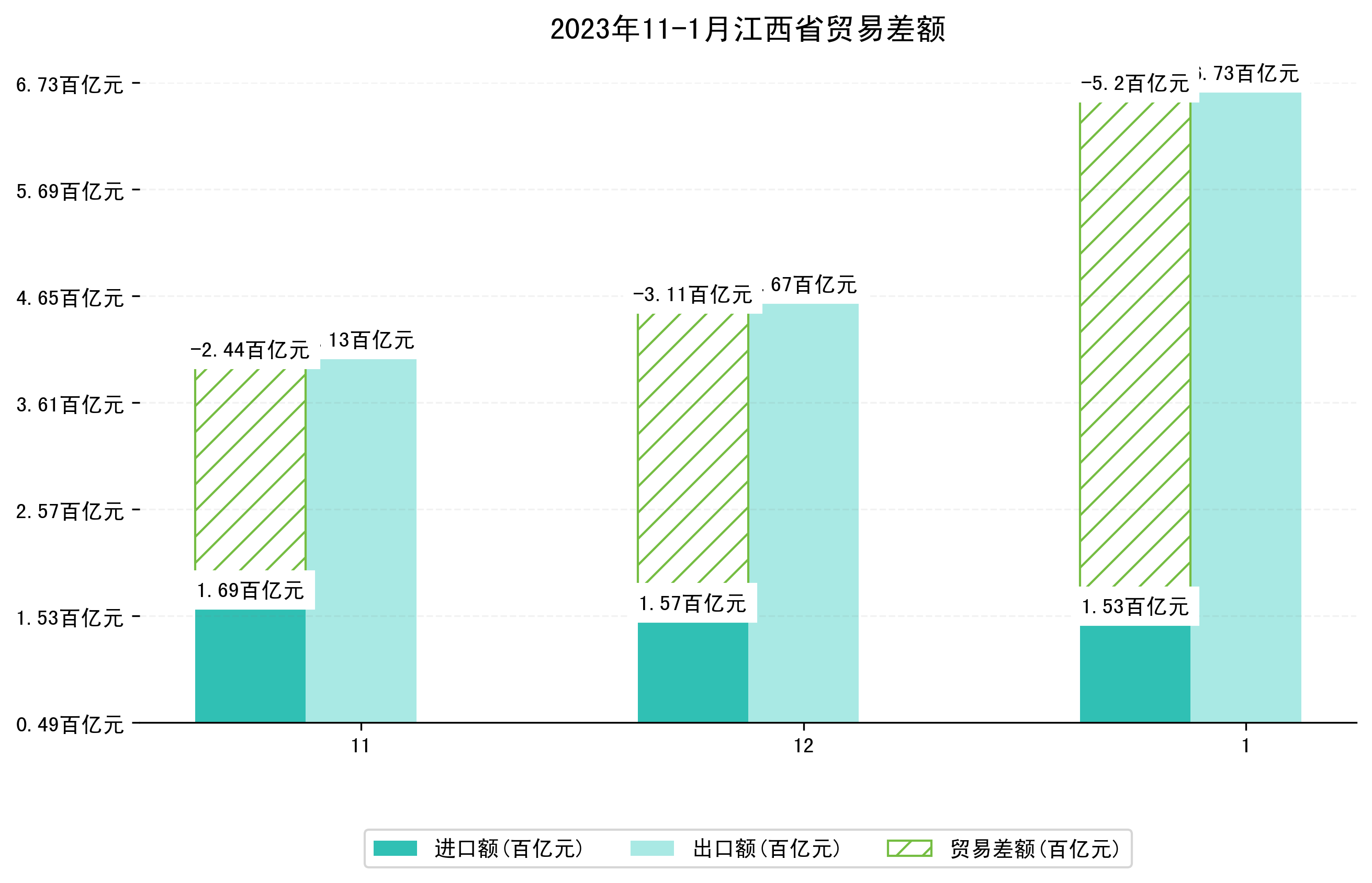 以美元计,2023年1-1月江西省进出口总额为118,3802.2997万美元,相比上年同期增加了34,7579.381万美元,同比增加42.60%。