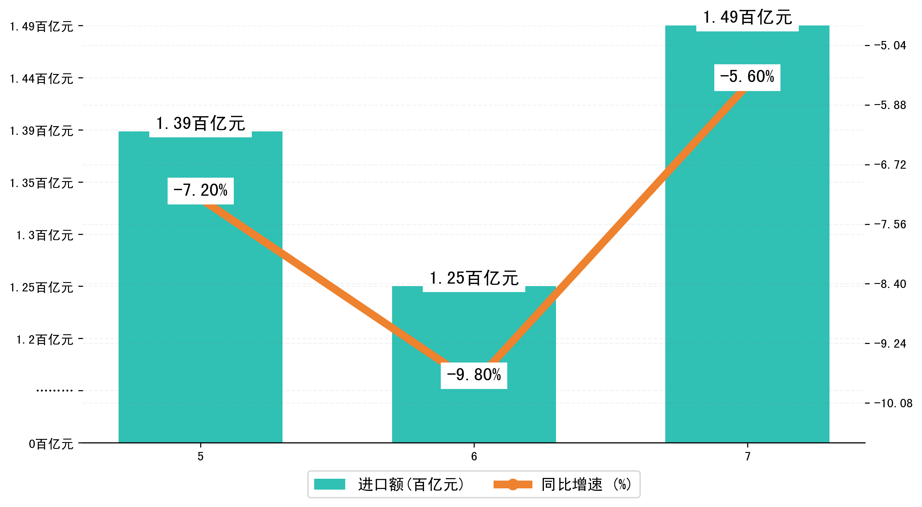 以人民币计,2024年1-7月郑州市进口额为920,6724.3243万元,相比上年同期减少了55,4469.5804万元,同比减少了-5.60%。