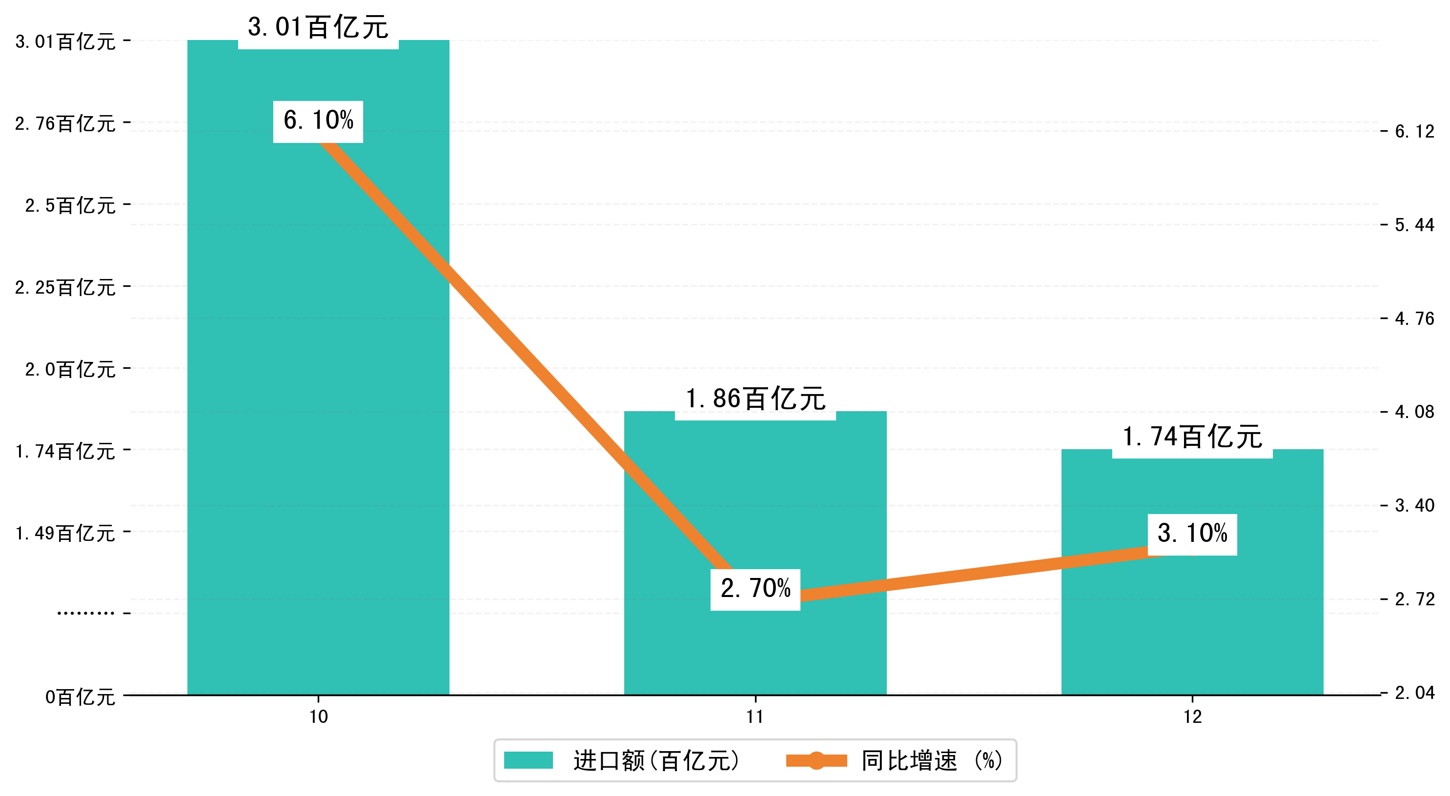 以美元计,2024年1-12月郑州市进口额为283,2697.8865万美元,相比上年同期增加了6,2819.7334万美元,同比增加2.30%。