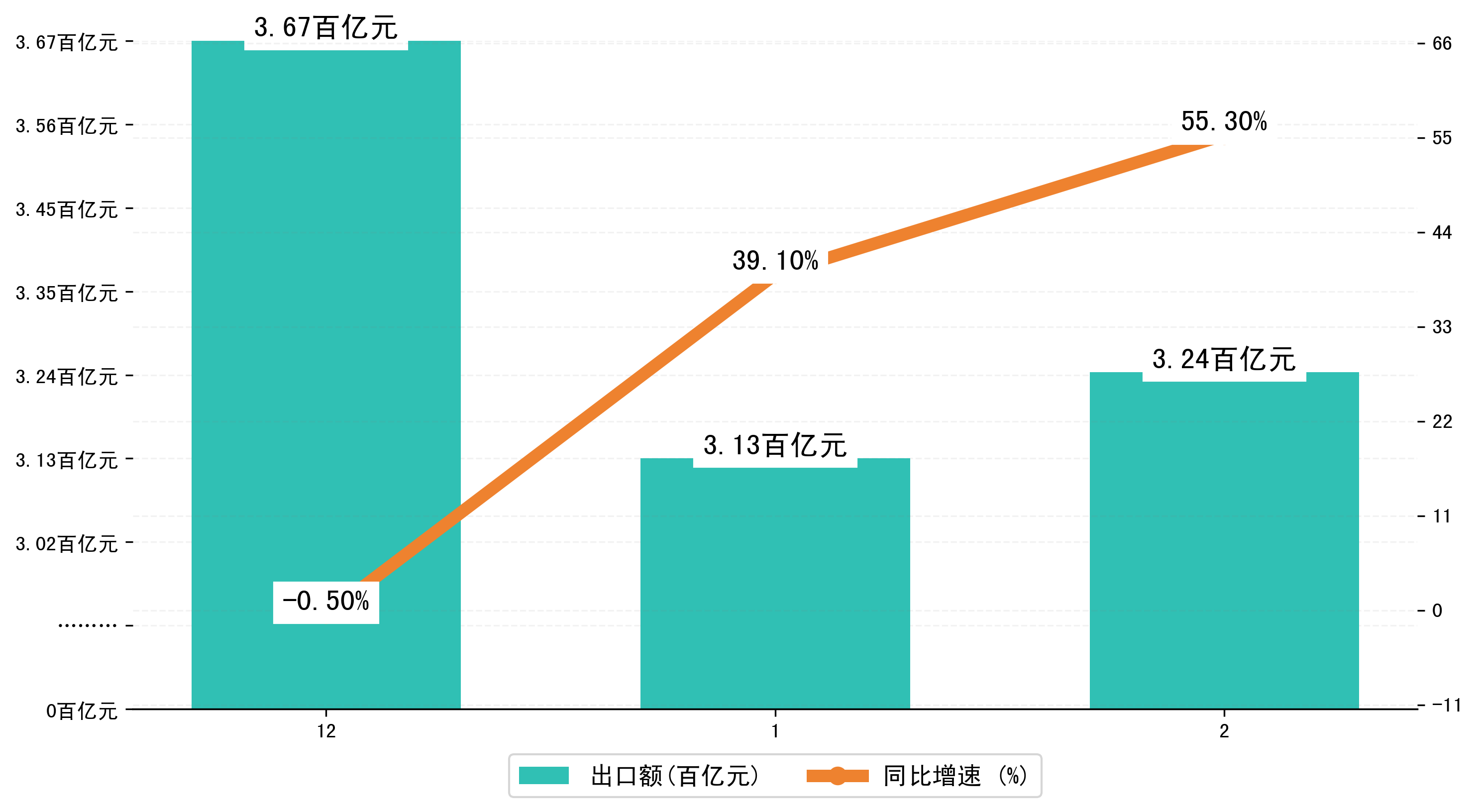 以美元计,2025年1-2月郑州市出口额为88,6452.6053万美元,相比上年同期增加了31,0860.8975万美元,同比增加53.50%。