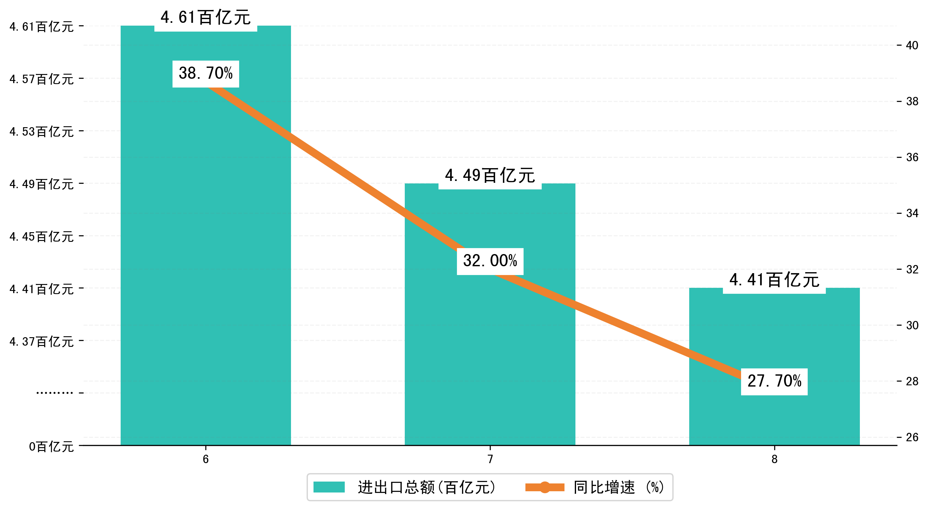 以人民币计,2025年1-8月郑州市进出口总额为3634,8697.1445万元,相比上年同期增加了790,7321.4068万元,同比增加了27.70%。