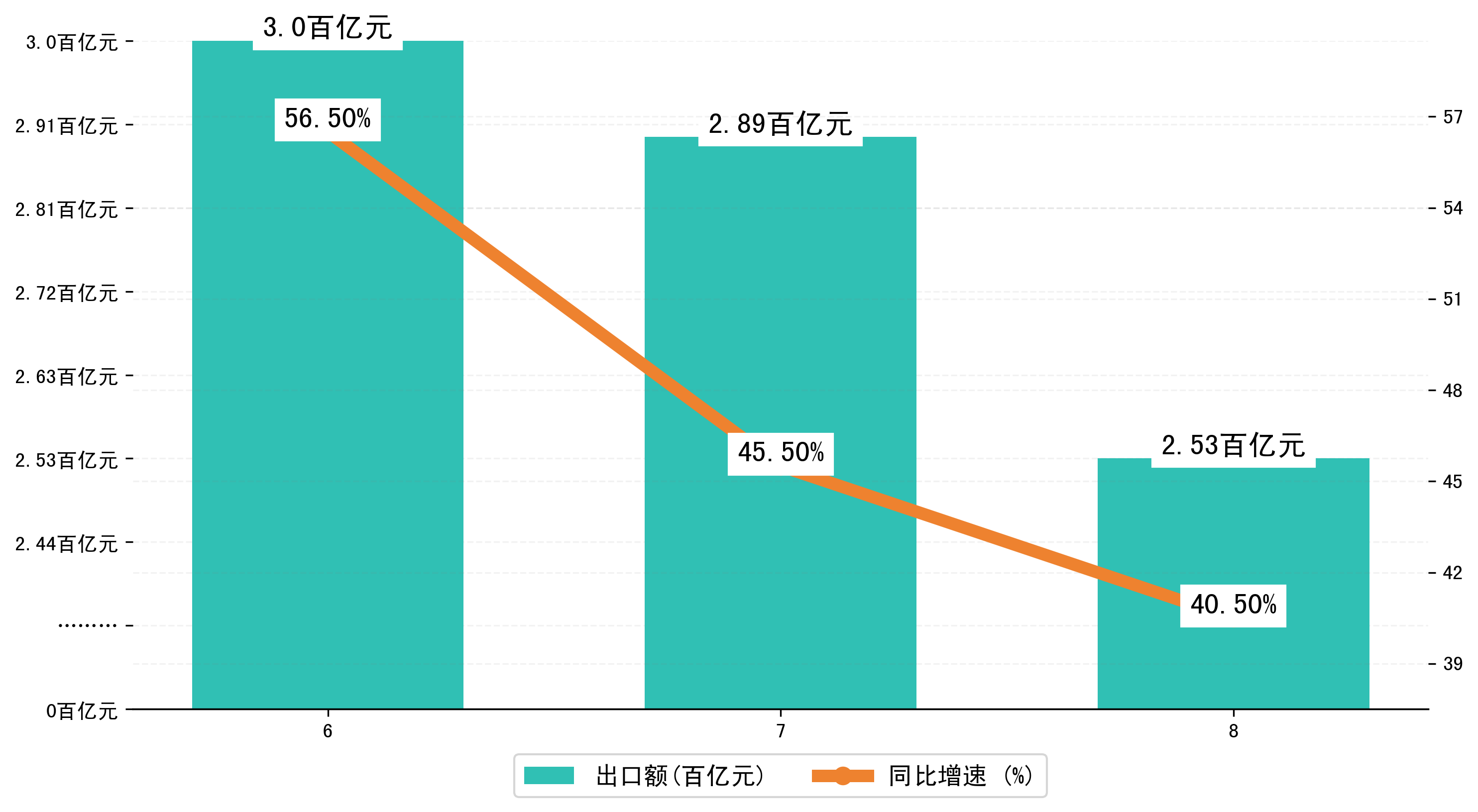 以美元计,2025年1-8月郑州市出口额为338,9593.0585万美元,相比上年同期增加了95,5740.6085万美元,同比增加39.10%。