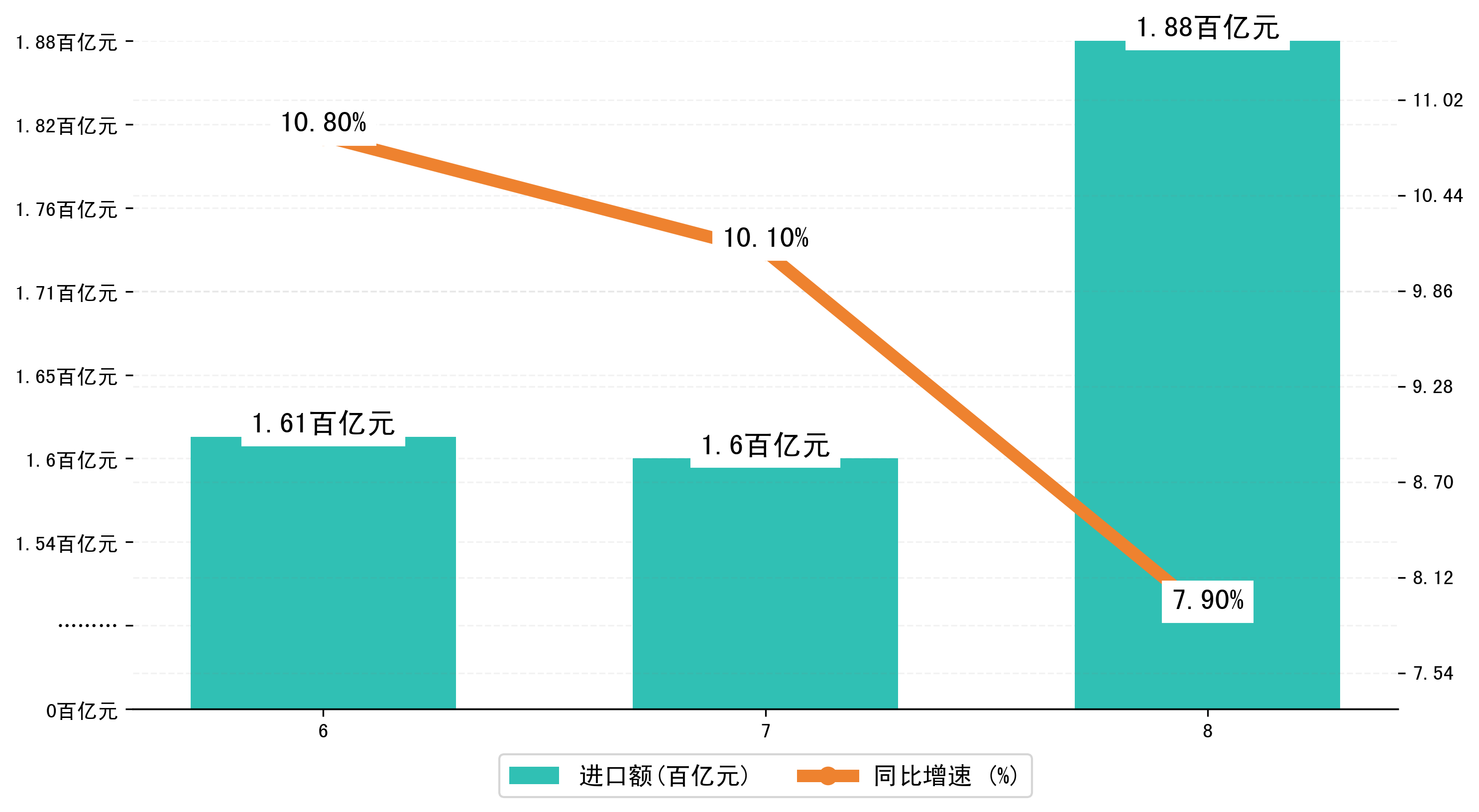 以人民币计,2025年1-8月郑州市进口额为1200,5493.0919万元,相比上年同期增加了86,7612.9458万元,同比增加了7.90%。