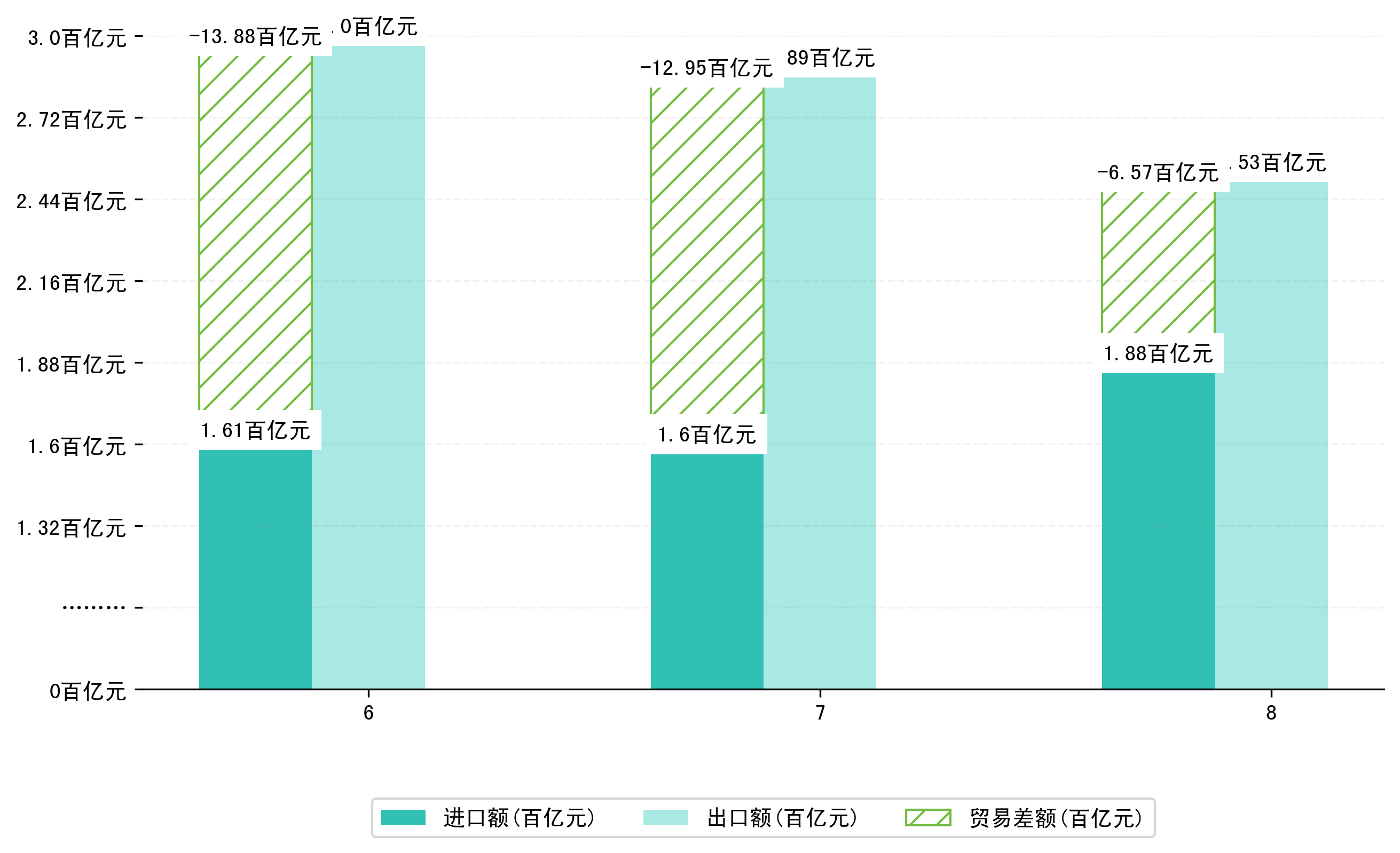 以美元计,2025年8月郑州市贸易差额为9,1688,9224万美元(贸易顺差),相比上月减少了8,8815,6826万美元;相比上年同期增加了3,5698,2249万美元,同比增加63.76%。