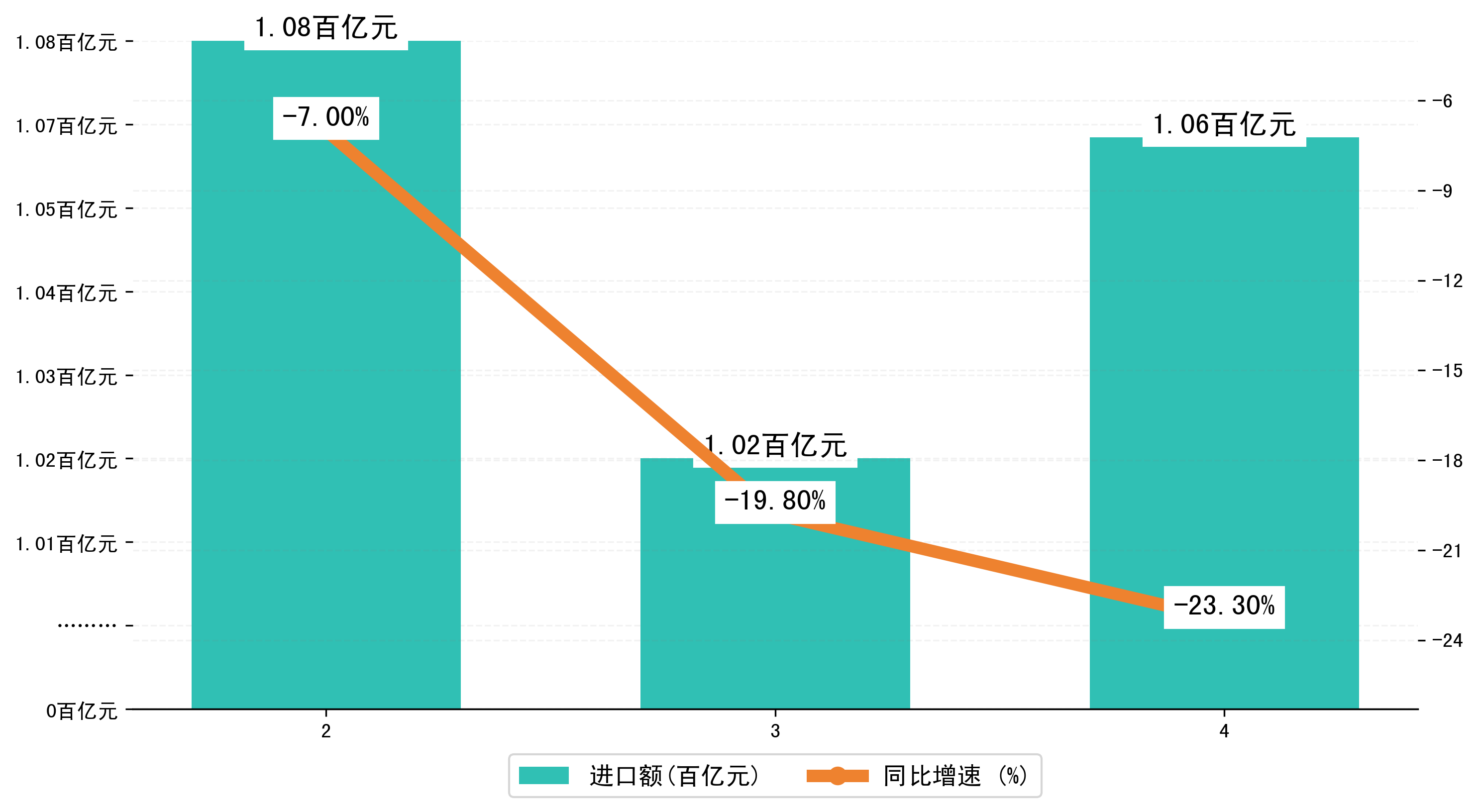 以人民币计,2023年4月郑州市进口额为106,3412.437万元,相比上月增加了4,4466.6082万元;相比上年同期减少了58,1281.1082万元,同比减少了-23.30%。