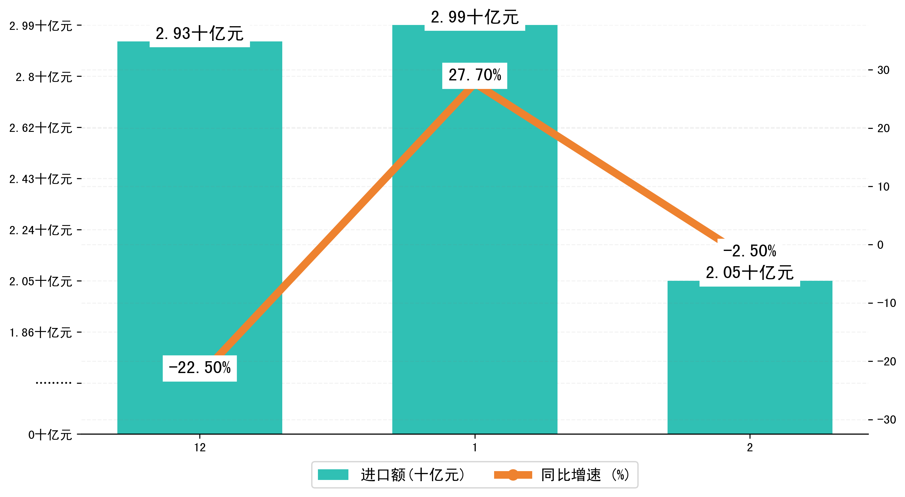 以人民币计,2024年2月中山市进口额为20,4975.9819万元,相比上月减少了9,4264.0835万元;相比上年同期减少了7,9632.4888万元,同比减少了-2.50%。